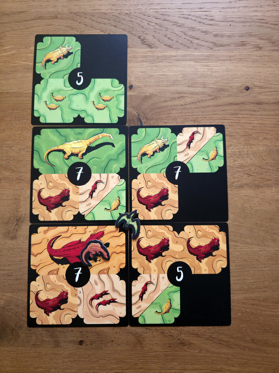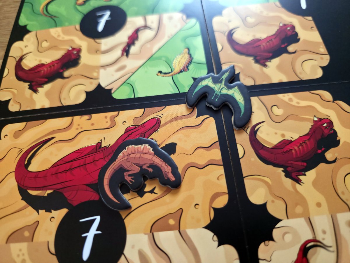 Die neuen Regeln greifen dabei erstaunlich organisch in das bekannte System ein. Die Flugsaurier bringen eine völlig neue Art von Bewegung ins Spiel. Sie schweben gewissermaßen über den klassischen Fressketten und können sich flexibler positionieren, was ihnen erlaubt, Beute zu schlagen, die für bodengebundene Dinos unerreichbar wäre. Gleichzeitig sind sie aber empfindlicher gegenüber bestimmten Ereignissen und müssen clever eingesetzt werden, um nicht selbst zum Opfer zu werden. Ihr Spielgefühl ist dynamisch, fast tänzelnd — ein schönes Gegengewicht zu den eher direkten Fressduellen des Grundspiels.