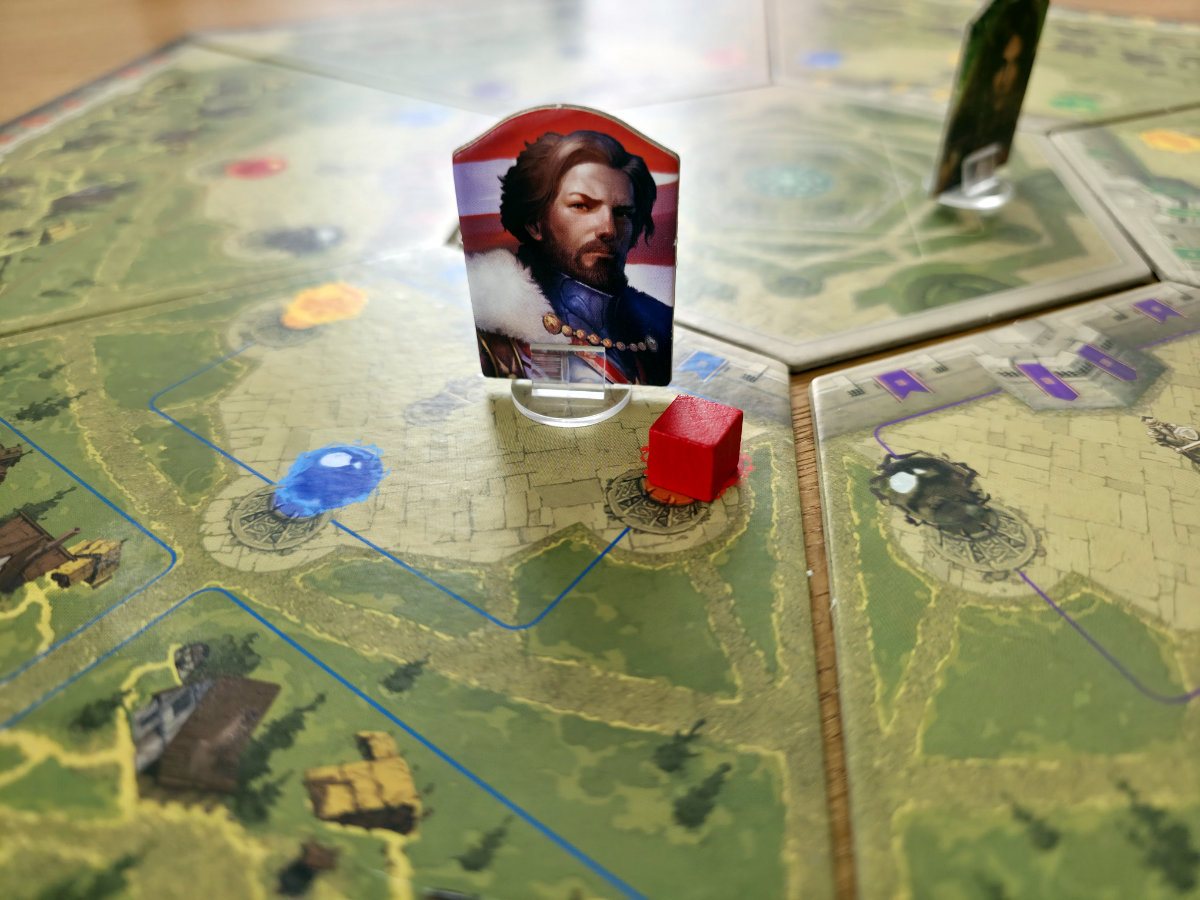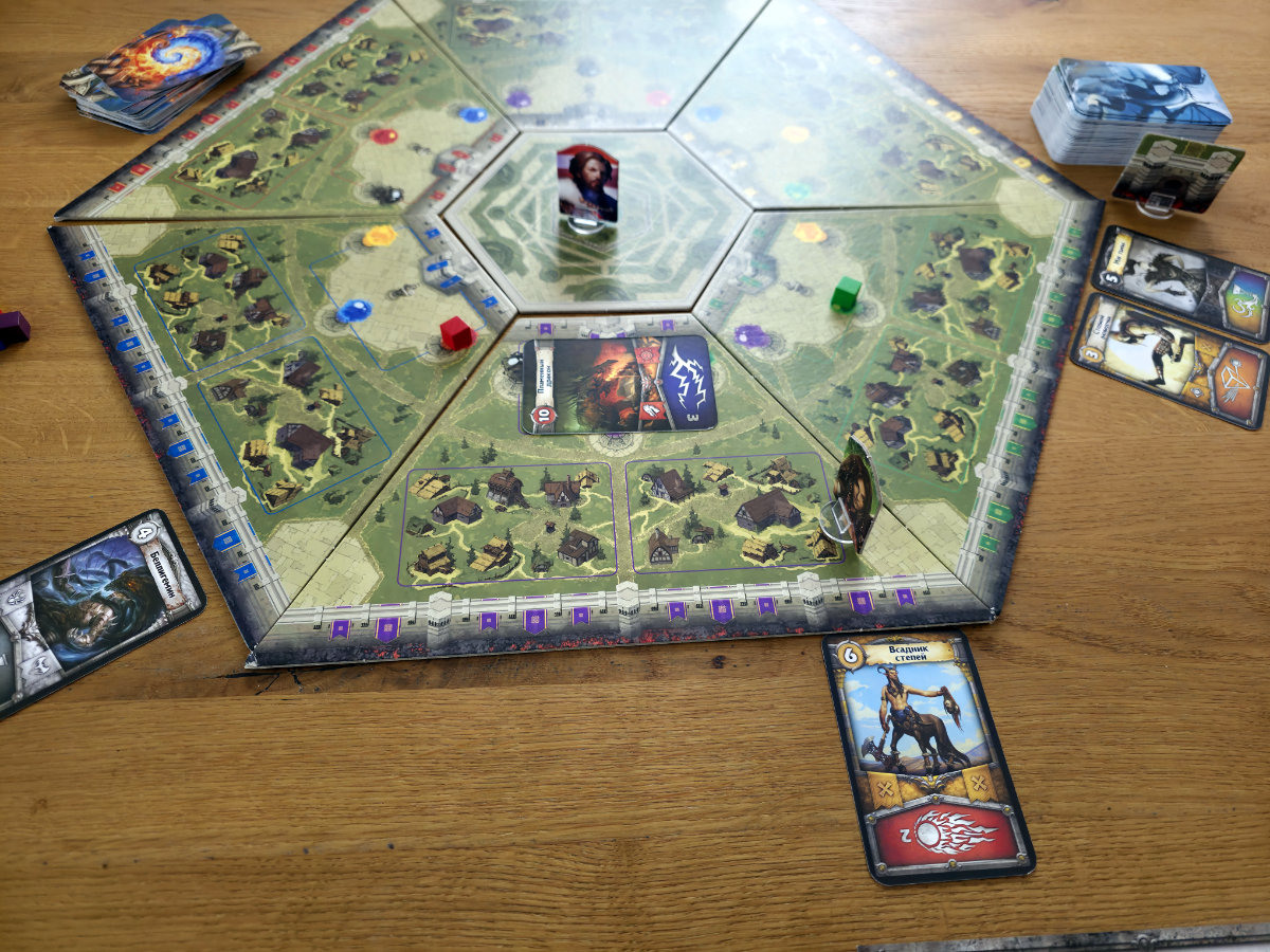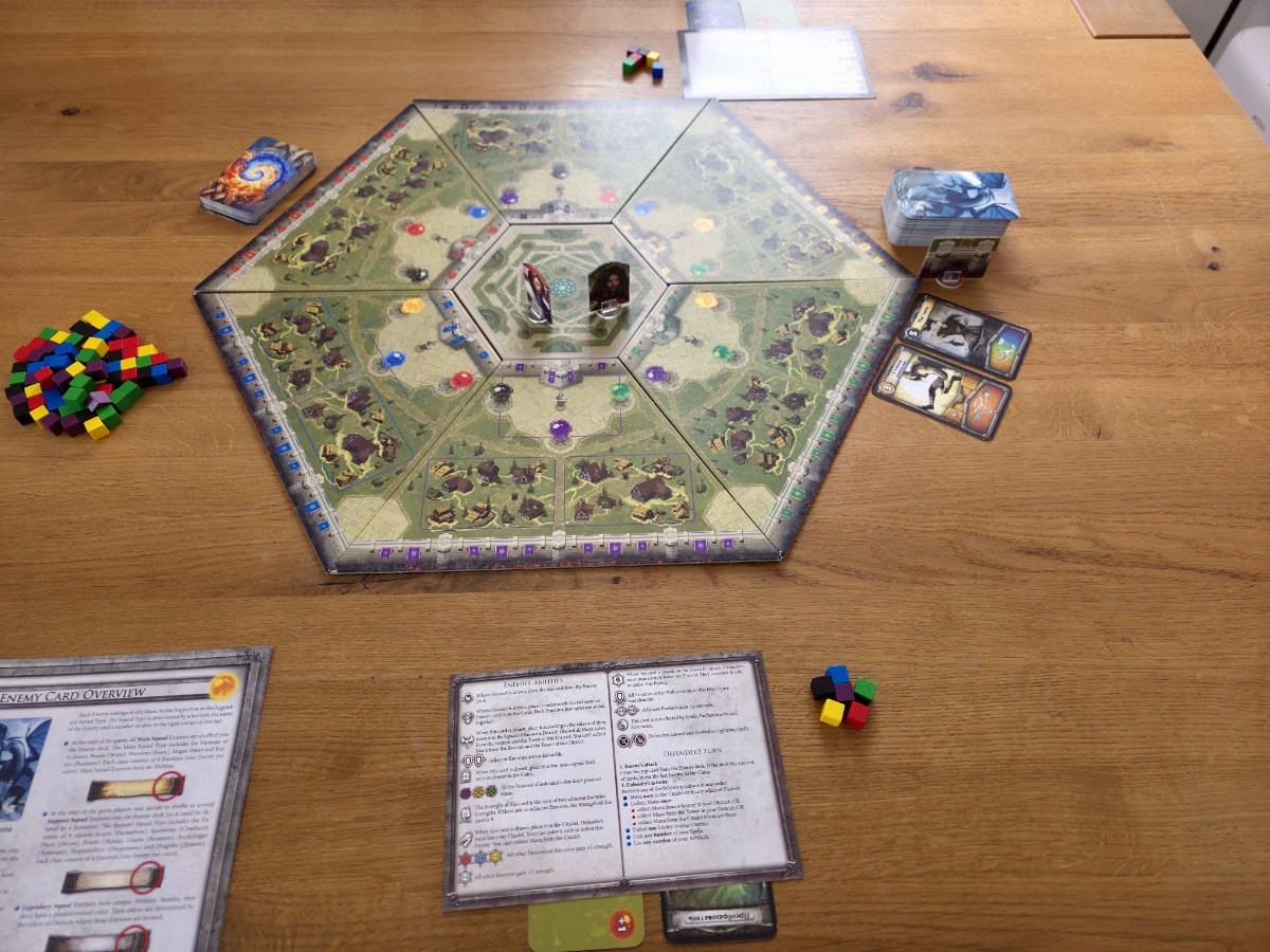 Der Spielerzug ist dagegen ein kleines taktisches Puzzle. Jeder Verteidiger darf sich einmal bewegen, einmal Mana sammeln und einmal einen Gegner besiegen – aber nichts davon ist verpflichtend. Das Sammeln von Mana ist der Kernmechanismus des Spiels. Offene Quellen liefern drei Mana ihrer Farbe, schließen sich aber danach. Geschlossene Quellen können nur über den Turm des Distrikts geleert werden, der wiederum selbst geschlossen wird, wenn er benutzt wird. Und alle Türme lassen sich nur über die Zitadelle wieder öffnen. Dadurch entsteht ein Kreislauf, der cleveres Timing und gute Absprache erfordert. Die Spieler jonglieren mit sechs Farben von Mana, die jeweils den Farben der Feinde entsprechen. Um einen Gegner zu besiegen, muss exakt die Anzahl an Mana seiner Farbe abgegeben werden, die seiner Stärke entspricht. Manche Feinde – wie Golems – verlangen sogar Mana aller Farben. Jeder besiegte Gegner wird anschließend zu einem einmalig nutzbaren Zauber, der zusätzliche Bewegungen, Mana oder andere Vorteile gewährt. Diese Zauber sind mächtig, aber begrenzt, und ihr Einsatz entscheidet oft über Sieg oder Niederlage.