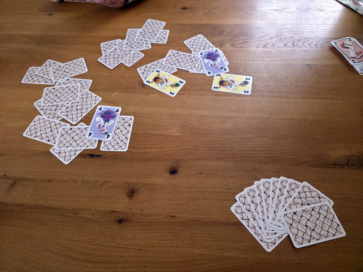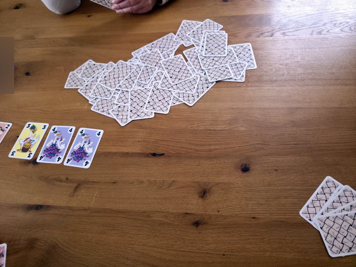 Der Ablauf ist ein klassischer Push‑your‑Luck‑Mechanismus, aber mit einem charmanten Twist. In seinem Zug deckt der Spieler eine Karte aus der verdeckten Tischmitte auf. Nach jeder Karte entscheidet man: weitermachen, aufhören oder passen. Weitermachen ist natürlich verlockend, denn jede Karte ist ein Punkt wert – und die blauen Einser sogar drei. Doch wehe, man deckt zweimal denselben Snack auf. Dann muss man alle offenliegenden Karten nehmen, ob man will oder nicht und prüfen, ob das persönliche Snacklimit überschritten wurde. Jede Farbe hat nämlich eine Obergrenze und wenn man darüber hinaus schlingt, spuckt die Gans die komplette Farbe wieder aus. Diese Karten sind dann aus dem Spiel – und das Triumphgefühl gleich mit.