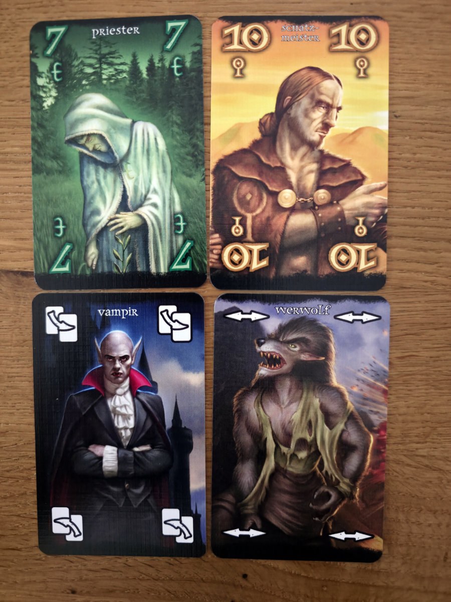 Doch die wahre Neuerung liegt in den Sonderkarten, die das Spielgefühl spürbar erweitern. Neben bekannten Effekten wie Gestaltenwandler, Bombe oder Drache bringt die Edition zwei brandneue Figuren ins Spiel: Hexe und Vampir. Die „Hexe“ erlaubt es, nach der Stichwertung eine Karte aus dem Stich gegen eine eigene zu tauschen – ein trickreicher, fast schon schelmischer Effekt, der Stiche plötzlich kippen lässt. Der „Vampir“ hingegen kopiert die Karte, die zu Beginn der Runde die Trumpffarbe bestimmt hat – inklusive aller Effekte. Das eröffnet taktische Tiefen, die weit über das klassische Wizard hinausgehen. Kombiniert man diese Karten mit den bereits etablierten Sonderrollen wie Wolke, Werwolf oder Jongleur, entsteht ein Spiel, das vertraut wirkt, aber gleichzeitig neue strategische Räume öffnet.