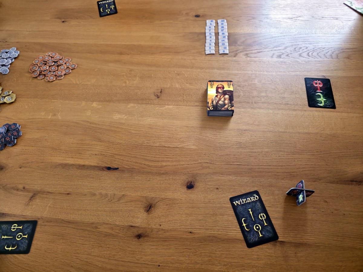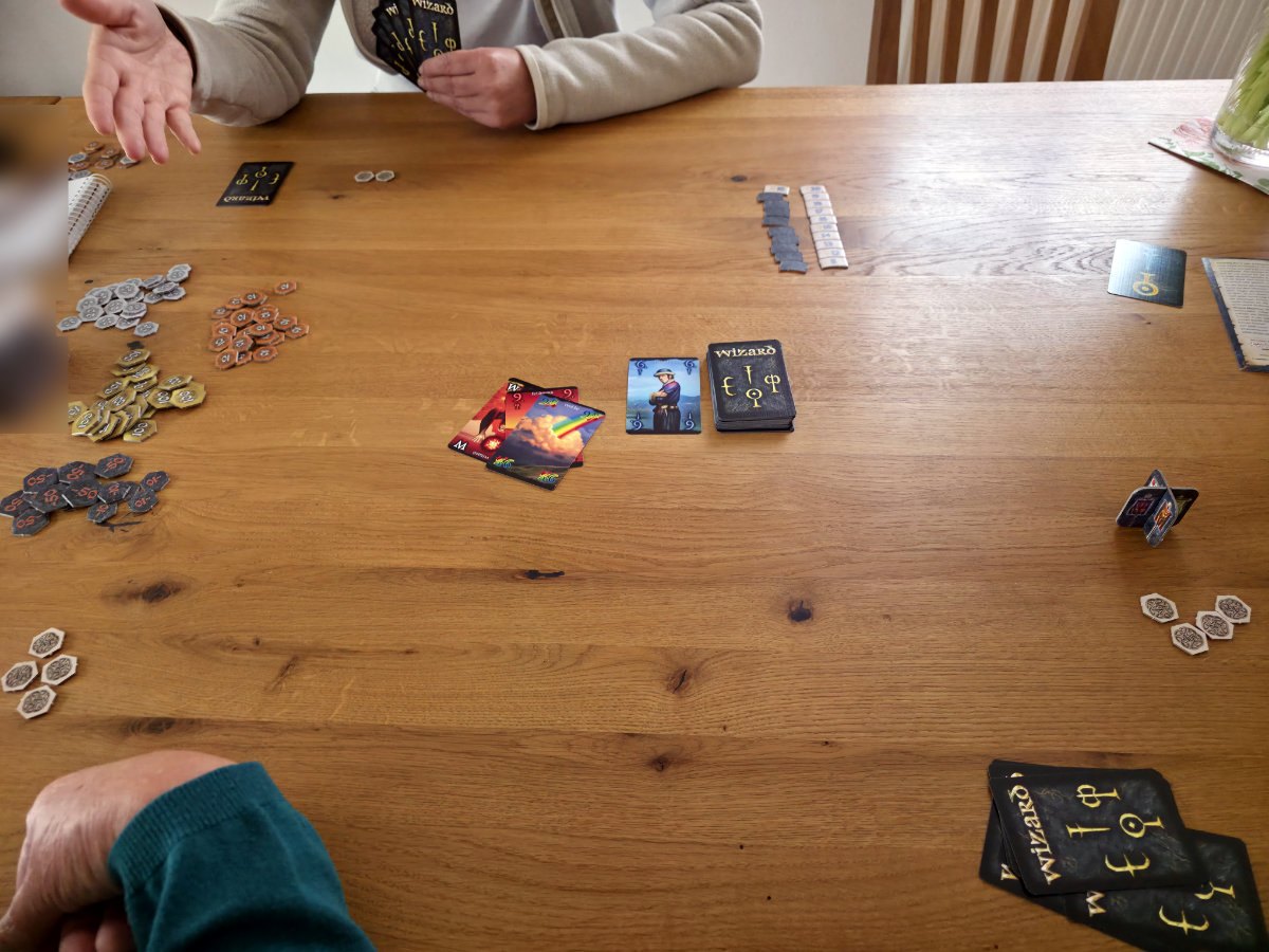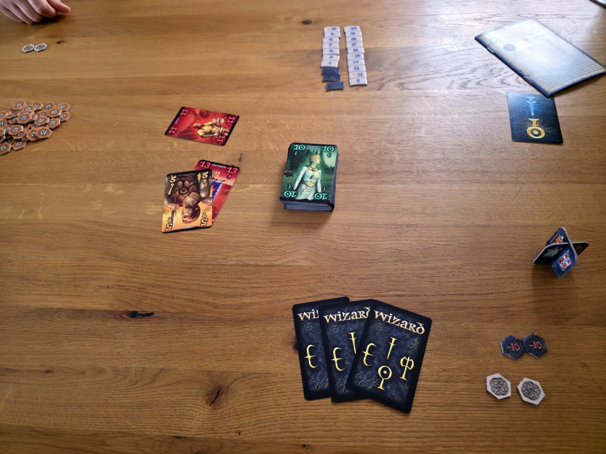 Im Kern bleibt Wizard das, was es immer war, ein raffiniertes Vorhersagespiel, bei dem nicht das Glück, sondern die Kunst der Einschätzung triumphiert. Jede Runde beginnt mit dem Austeilen der Karten – erst eine, dann zwei, dann drei, bis die letzte Runde alle Karten umfasst. Eine aufgedeckte Karte bestimmt die Trumpffarbe, es sei denn, ein Wizard oder ein Narr (bzw. die entsprechenden Sonderkarten) mischen sich ein. Danach folgt der entscheidende Moment, die Vorhersage. Wie viele Stiche wird man machen? Ein Stich zu viel oder zu wenig und schon purzeln die Punkte. Trifft die Vorhersage exakt, winken satte Belohnungen. Der anschließende Stichablauf folgt klassischen Regeln. Farbe bedienen, Trumpf sticht, Wizards stehen über allem, Narren unter allem – und doch entsteht in jeder Runde ein kleines Drama aus Risiko, Timing und Psychologie.