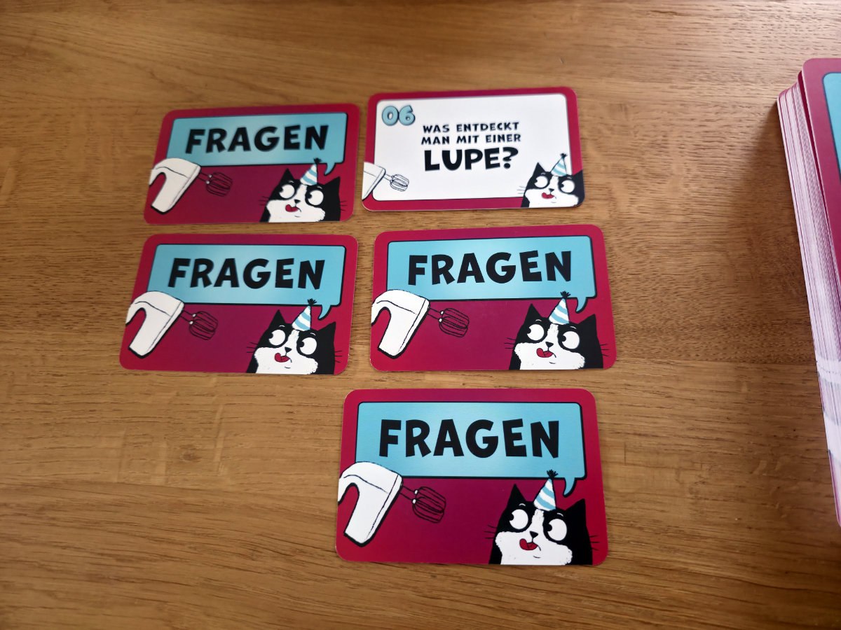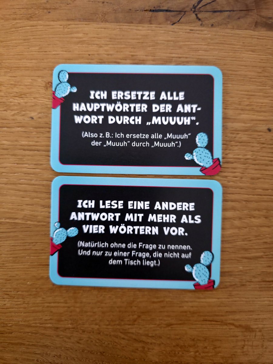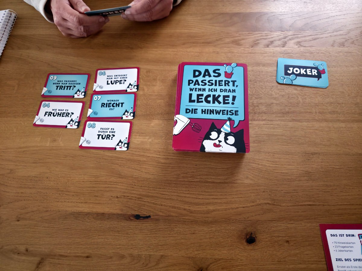 Die Regeln bleiben dabei angenehm schlank. Eine Person kennt den Begriff, die anderen stellen Fragen – oder ziehen Jokerkarten, die das Ganze noch weiter in Richtung Chaos schubsen. Die Joker sorgen für zusätzliche Wendungen, sei es durch besonders verrückte Zusatzhinweise oder kleine Gemeinheiten, die das Raten erschweren. Gespielt werden kann kooperativ – alle gegen den Begriff – oder kompetitiv, wenn man die Gruppe in ein fröhliches Wettraten schicken möchte. Punkte sind möglich, aber wie bei allen guten Partyspielen eigentlich nur ein höflicher Hinweis darauf, wer sich am Ende am lautesten feiern darf.