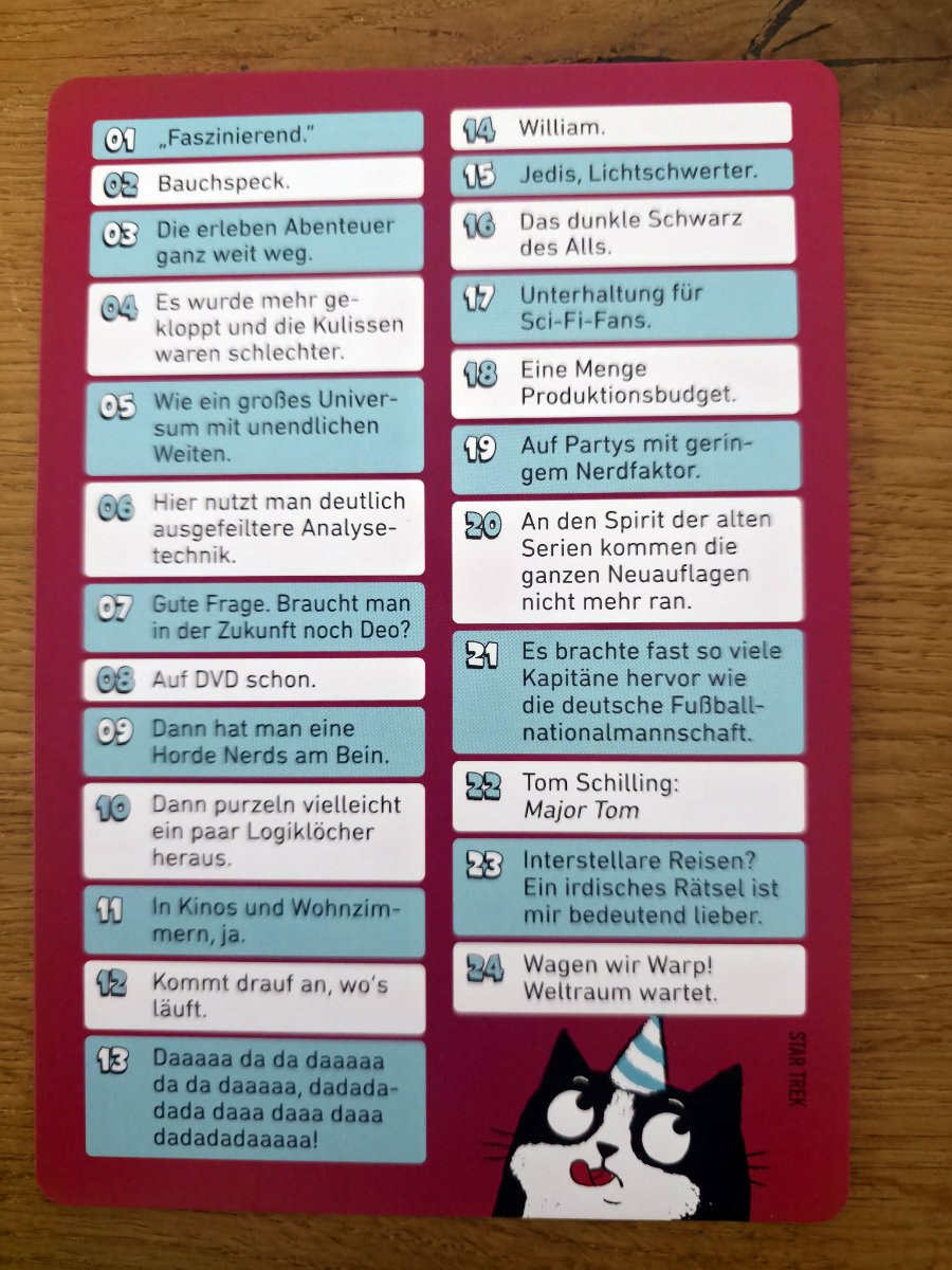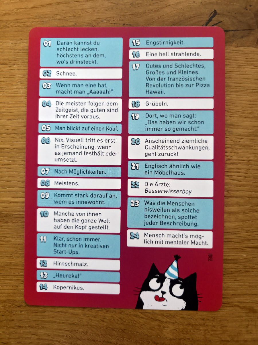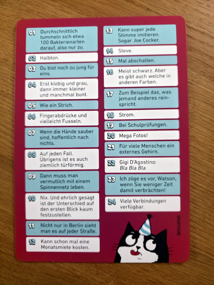 Der Ablauf ist so simpel wie genial. Ein Spieler zieht eine Karte, die den gesuchten Begriff enthält und ganz viele schräge Antworten, passend zu den Fragekarten und die anderen Spieler versuchen, den Begriff zu erraten. Das Besondere dabei, die Hinweise stammen aus einem Set von 24 völlig absurden Fragen, die man normalerweise wohl nie stellen würde. „Wie schmeckt es?“, „Was sieht man mit einer Lupe?“, „Passt es durch eine Tür?“ – solche Fragen werden plötzlich zu ernsthaften Analysewerkzeugen. Und weil die 75 Begriffe alles sein können – von Popkultur über Alltagsgegenstände bis hin zu abstrakten Konzepten – entstehen Antworten, die irgendwo zwischen Genieblitz und dadaistischem Theater liegen. Gesucht werden z.B. „Smartphone“, „Idee“, „Star Trek“ u.v.a. Es ist ein buntes Fest^^.