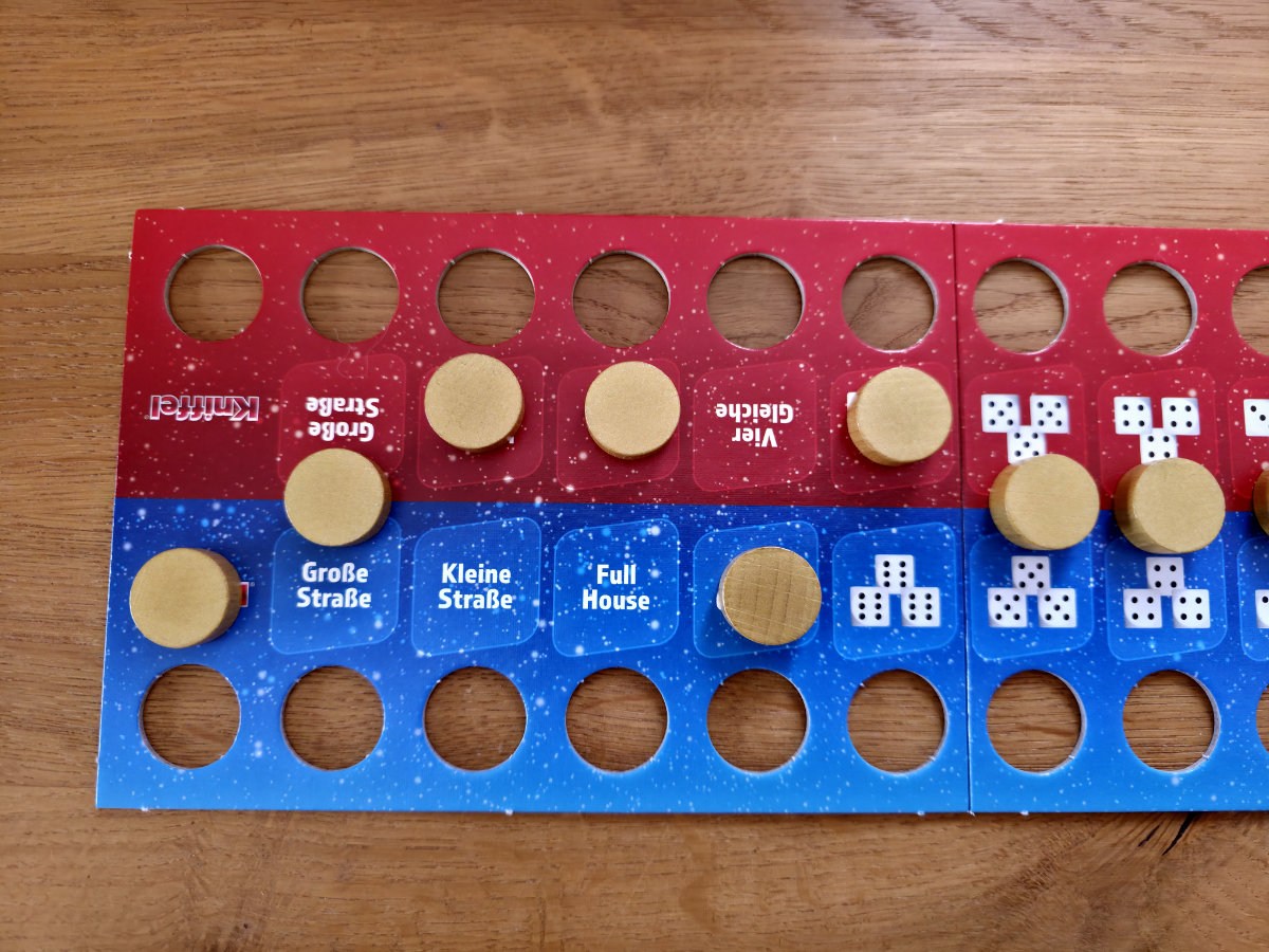 Der Clou liegt im Spielplan: Elf Bereiche, jeder mit einer typischen Kniffel‑Kombi – von Dreierpasch über Full House bis zur Großen Straße. In jedem Bereich liegt zu Beginn eine goldene Scheibe genau in der Mitte. Schaffst du die passende Kombination, ziehst du die Scheibe auf dein Feld. Schaffst du dieselbe Kombi später erneut, während die Scheibe schon bei dir liegt, sicherst du sie endgültig in deinem Loch. Und genau hier entsteht der Reiz: Die Scheibe wandert ständig hin und her, denn dein Gegenüber kann sie dir jederzeit wieder entreißen, solange sie noch nicht gesichert ist. Erst wenn sie im Loch sitzt, ist sie endgültig dein – und jede gesicherte Scheibe fühlt sich an wie ein kleiner Triumph.