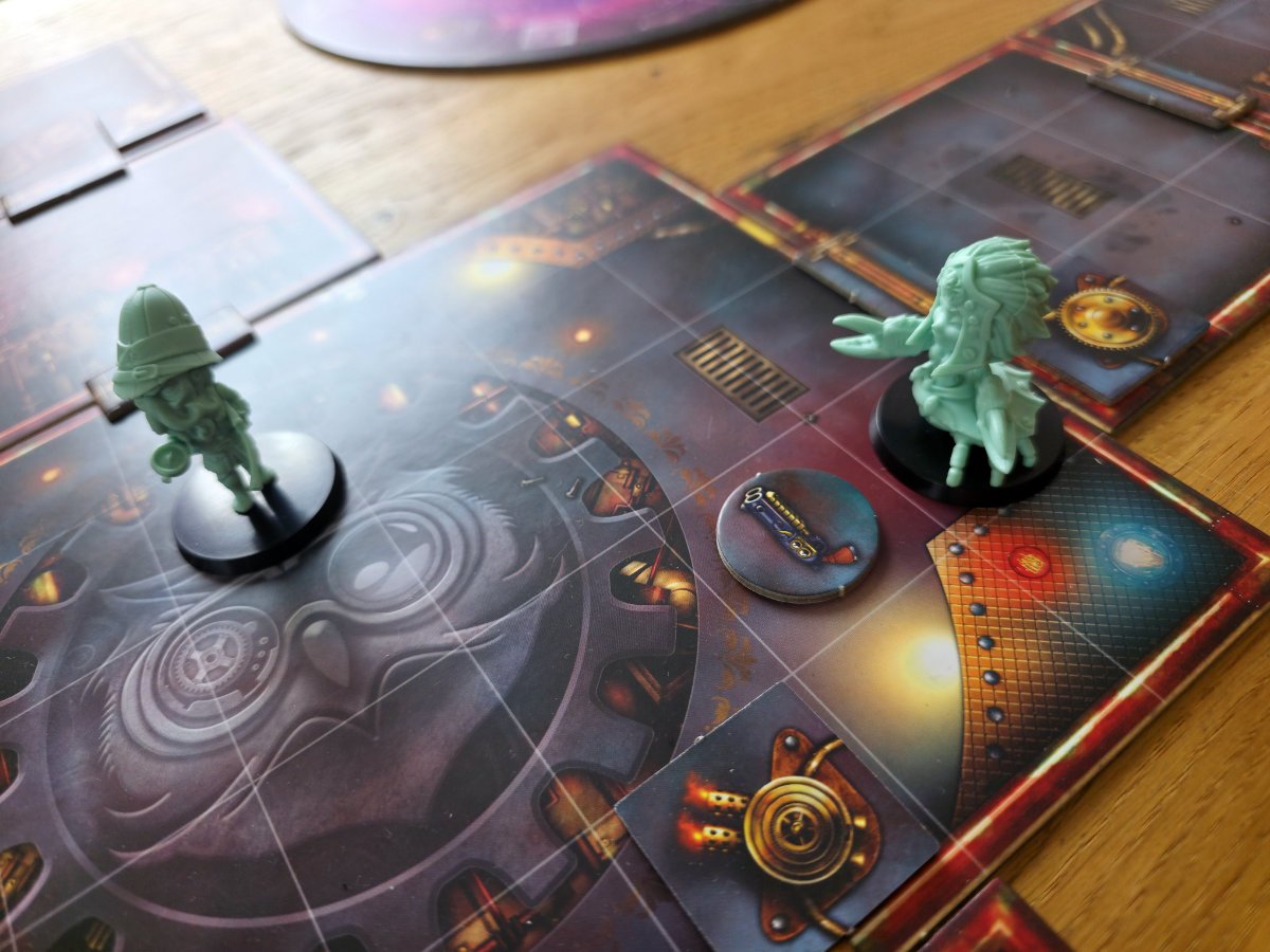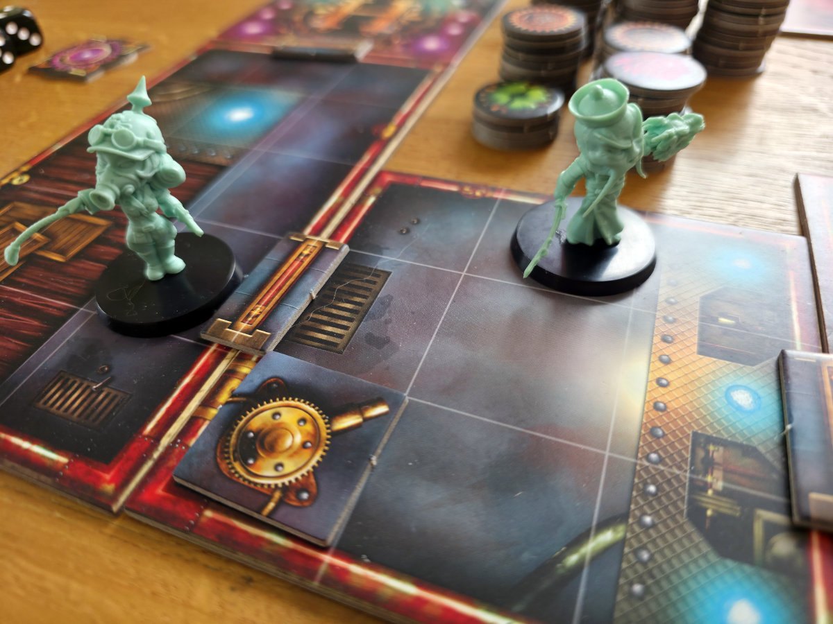 Mechanisch bewegt sich „Dimensions of Madness“ im Terrain eines taktischen Skirmish‑Spiels, allerdings mit einem zugänglicheren Anspruch. Die Aktionspunkte sind klar, die Bewegungsregeln nachvollziehbar und die modulare Spielfläche sorgt dafür, dass jede Partie ein wenig anders aussieht. Das Spieltempo ist angenehm straff. Man plant, man positioniert, man löst aus – und plötzlich kippt die Lage, weil eine Figur eine Fähigkeit zündet, die man unterschätzt hat. Genau diese kleinen Überraschungsmomente halten die Spannung hoch, ohne das Spiel unnötig kompliziert zu machen.