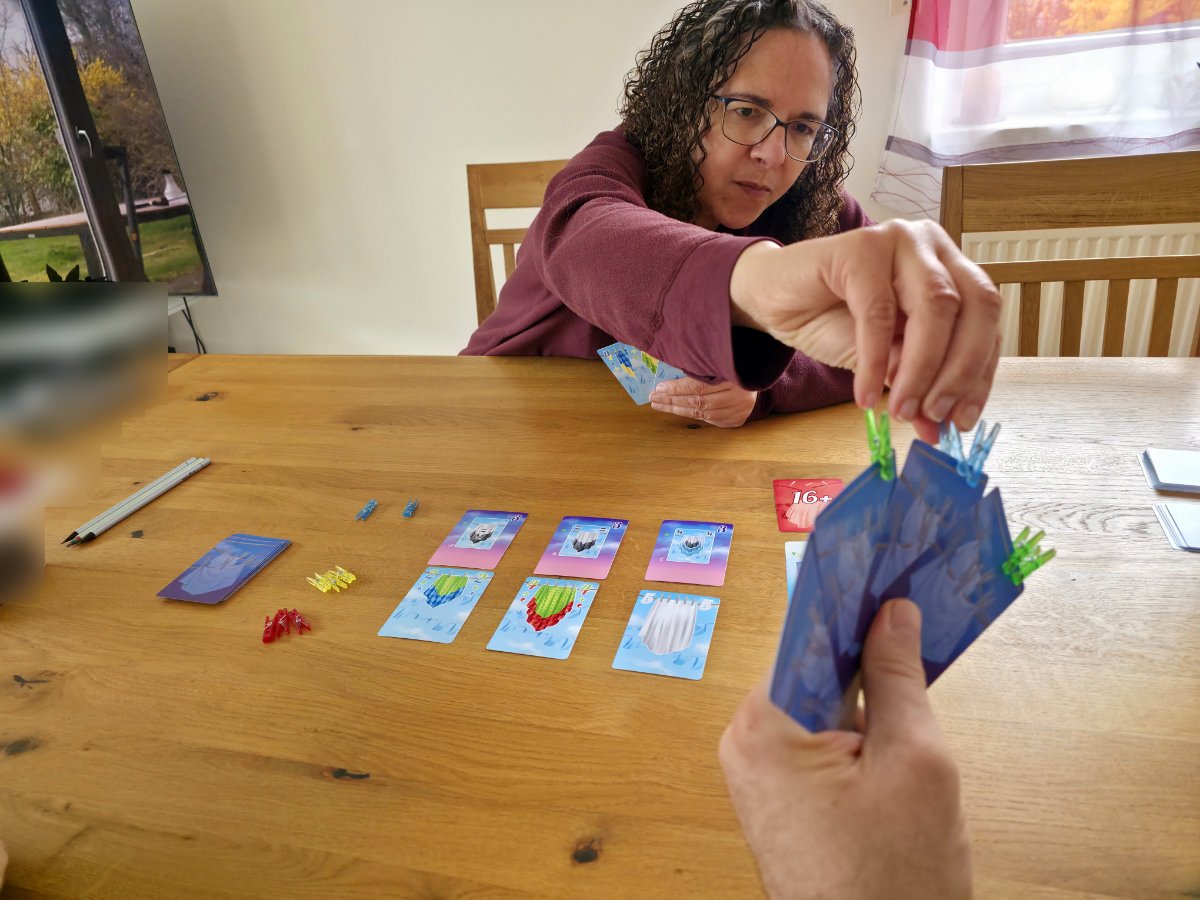 Im Zentrum stehen Stoffkarten, deren Vorderseiten nur für die Mitspielenden sichtbar sind. Die eigene Hand bleibt ein Mysterium, das sich ausschließlich über farbige (Wäsche-)Klammern erschließen lässt. Diese Klammern sind das kommunikative Herzstück des Spiels. Sie werden an Karten gesteckt, um Hinweise zu geben – aber stets streng begrenzt durch die Regeln der jeweiligen Karte. Mal verraten sie, welche Farben eine Rolle spielen, mal wie viele Karten zu einem Auftrag passen könnten. Und weil über Zahlen und Farben nicht gesprochen werden darf, entsteht ein stilles, aber intensives Miteinander, das an „Hanabi“ erinnert, jedoch mit einem frischen, stoffigen Twist.