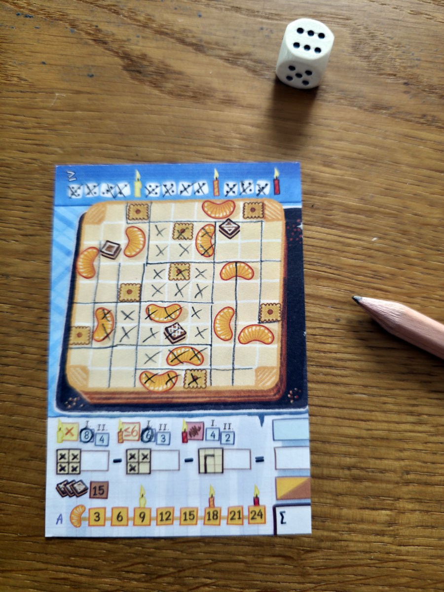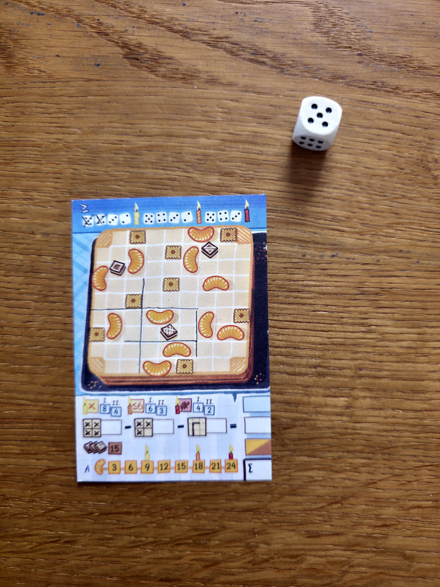 Runde für Runde entscheidet der gemeinsame Würfel darüber, wie groß der nächste Schritt ausfällt. Die geworfene Zahl zwingt zu einer von drei Aktionen. Ein neuer gerader Schnitt exakt in dieser Länge, das Verspeisen eines bereits vollständig abgetrennten Stücks mit maximal sechs Feldern oder das Ausmalen bereits angekreuzter Felder, um Krümel zu sammeln. Jede Entscheidung verändert das Gefüge des Kuchens, öffnet Chancen oder produziert Engstellen, die später kaum noch sinnvoll genutzt werden können.