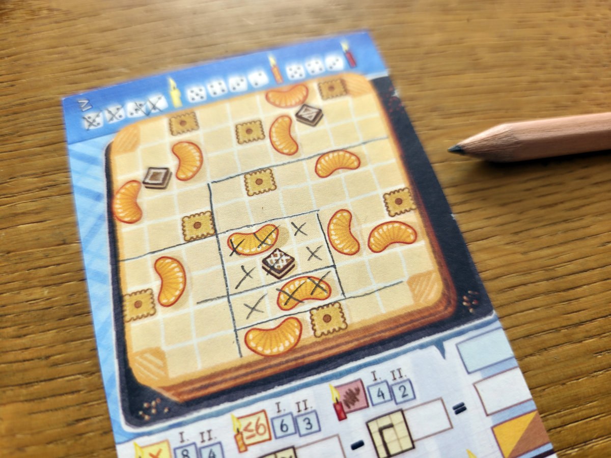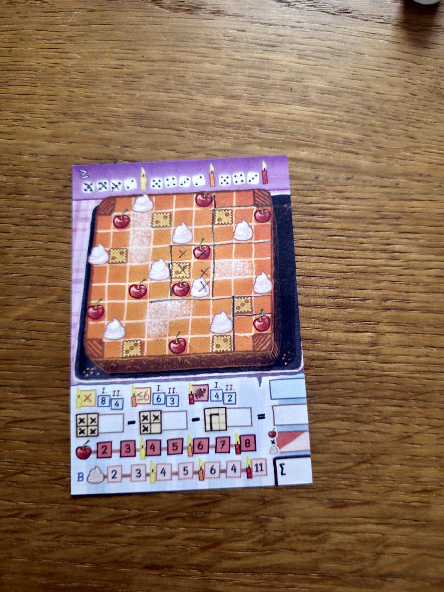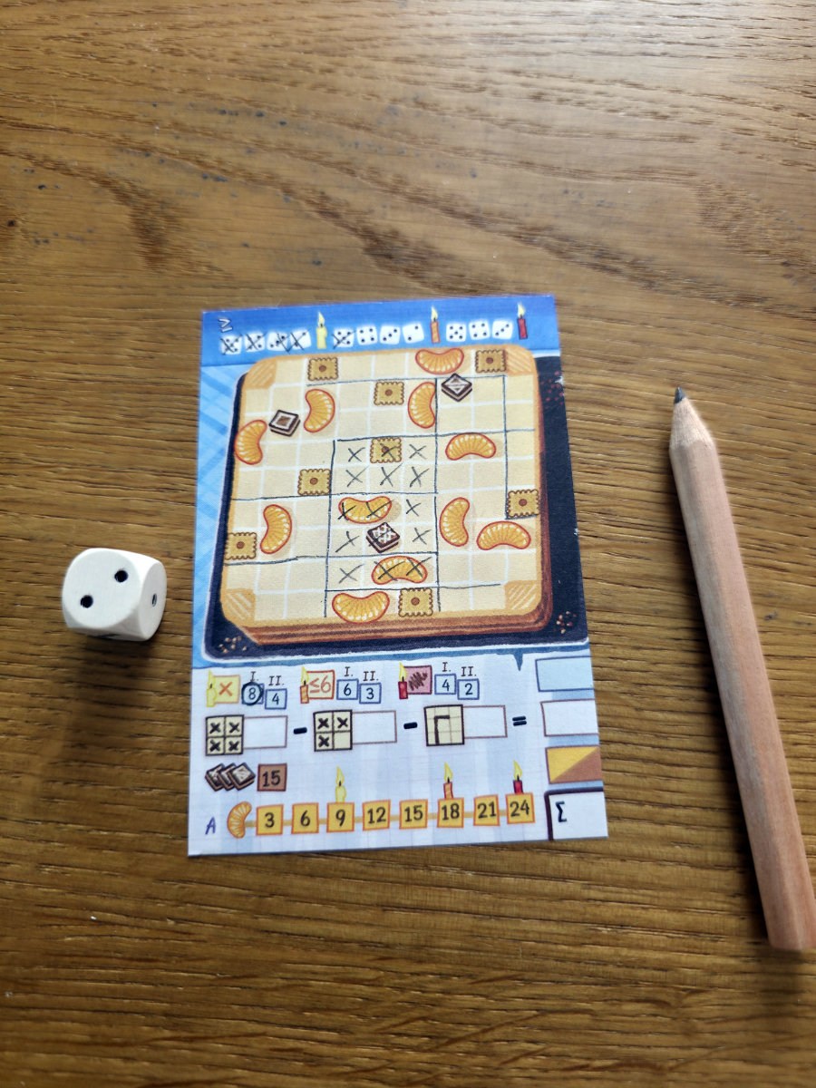 Parallel läuft ein Rundenfortschritt über Symbole, die abhängig vom Würfelergebnis abgestrichen werden. Erreichen die Markierungen die Kerzen, kommt es zu Zwischenwertungen; mit der letzten Kerze endet die Partie. Dann zeigt sich, wer seine Schnitte präzise gesetzt, rechtzeitig gegessen und unnötige Reste vermieden hat. Vollständig verspeiste Stücke bringen Punkte, angeknabberte oder unbrauchbare Fragmente dagegen Minuspunkte.