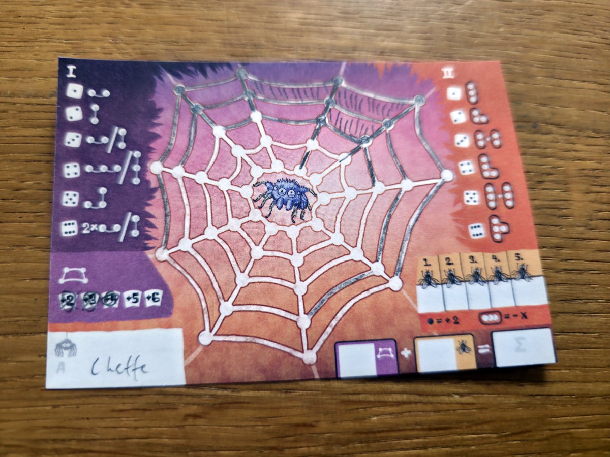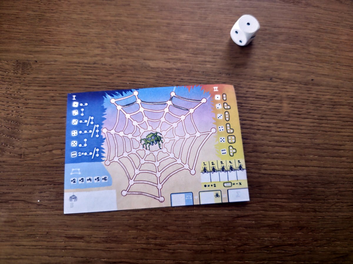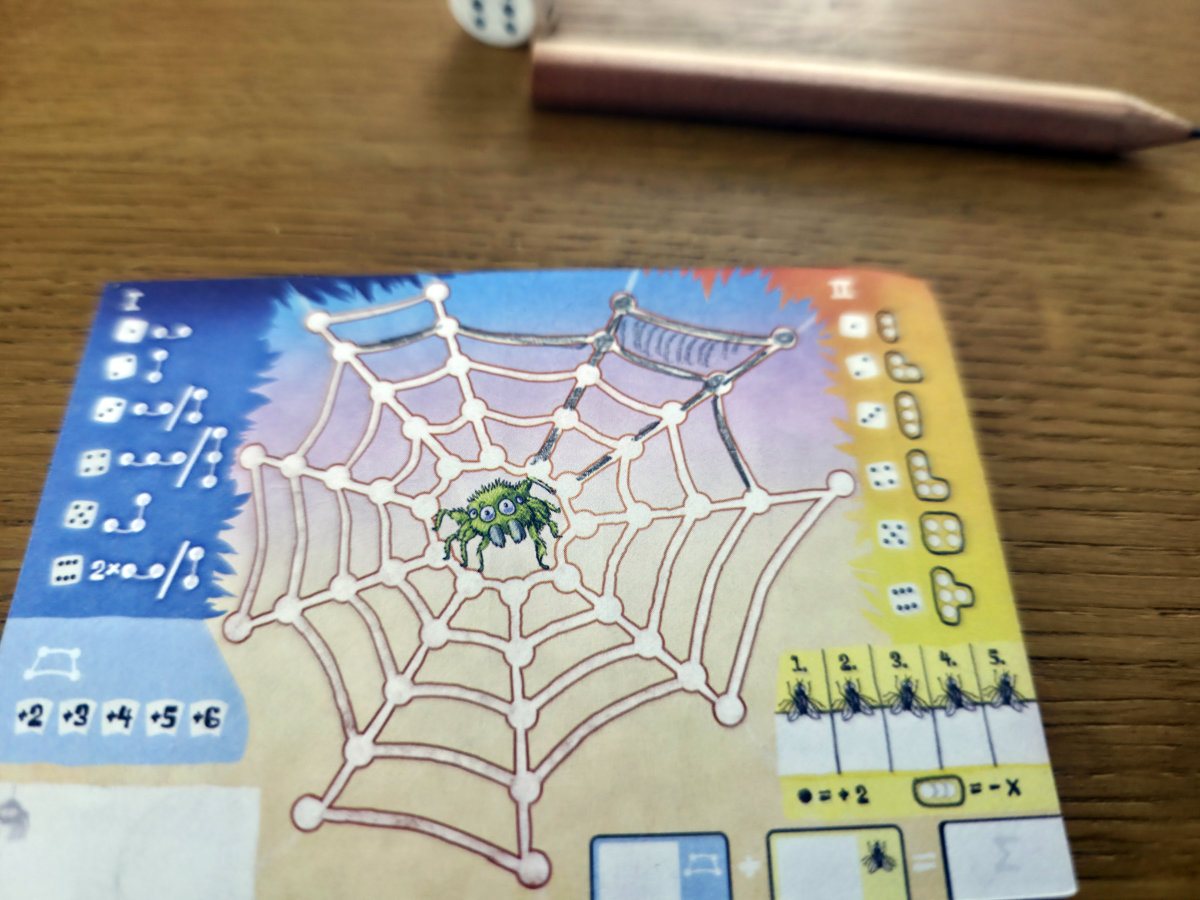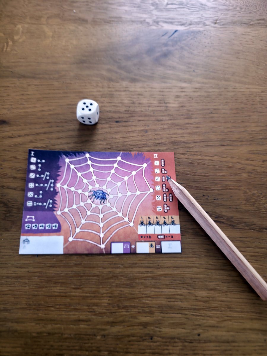 Review-Fazit zu „Rumspinnen“, einem knobeligen, versponnenen Roll&Write.