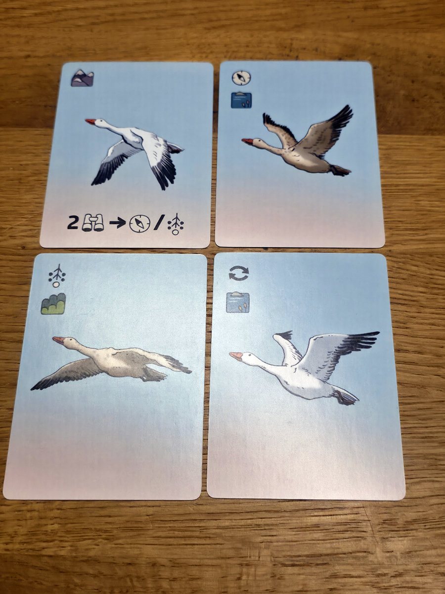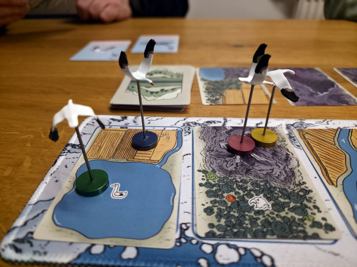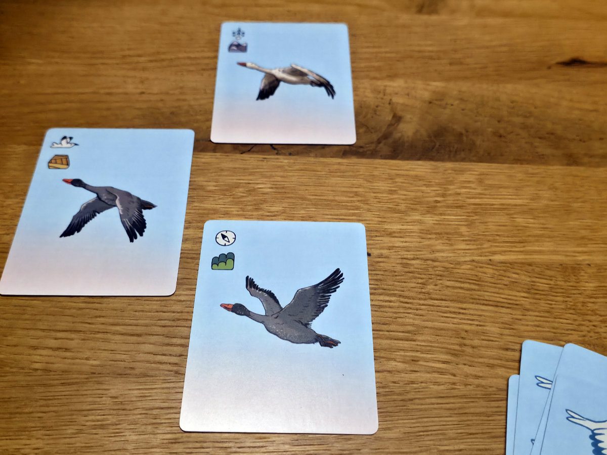 Der Ablauf ist elegant und schnell verinnerlicht. Um eine Gans auszuspielen legt man eine Karte in seine V‑Formation – zuerst die Leitgans, danach maximal sechs weitere Gänse, verteilt auf obere und untere Reihe à je drei. Jede neue Karte kann die Schwarmfigur (schicke Miniatur) entlang der Flugroute (Geländekartenauslage) bewegen, die Flugroute verlängern (vom Auslagestapel; bis zu 10 Karten dürfen ausliegen) oder den Schwarm „grasen“ lassen, um Karten loszuwerden und flexibel zu bleiben. Danach zieht man eine der drei offen ausliegenden Schneegänse-Karten nach und ergänzt wieder auf fünf.