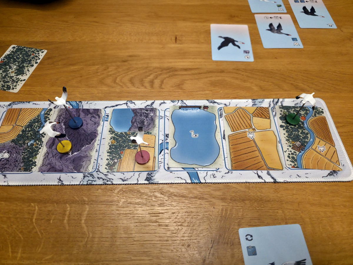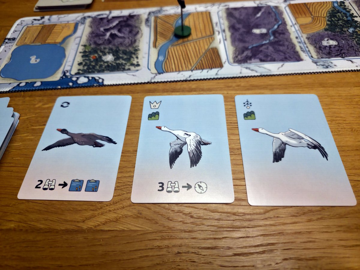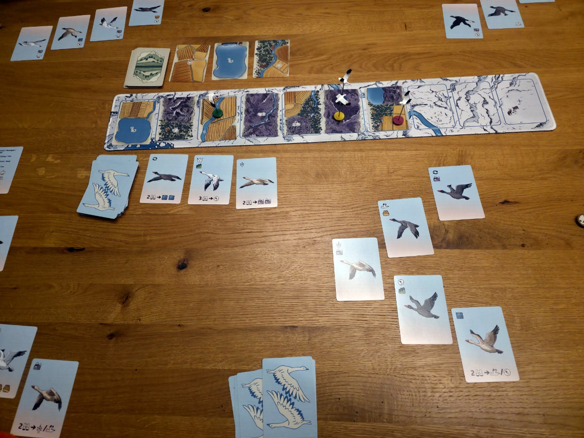 Der Ablauf ist elegant und schnell verinnerlicht. Um eine Gans auszuspielen legt man eine Karte in seine V‑Formation – zuerst die Leitgans, danach maximal sechs weitere Gänse, verteilt auf obere und untere Reihe à je drei. Jede neue Karte kann die Schwarmfigur (schicke Miniatur) entlang der Flugroute (Geländekartenauslage) bewegen, die Flugroute verlängern (vom Auslagestapel; bis zu 10 Karten dürfen ausliegen) oder den Schwarm „grasen“ lassen, um Karten loszuwerden und flexibel zu bleiben. Danach zieht man eine der drei offen ausliegenden Schneegänse-Karten nach und ergänzt wieder auf fünf.