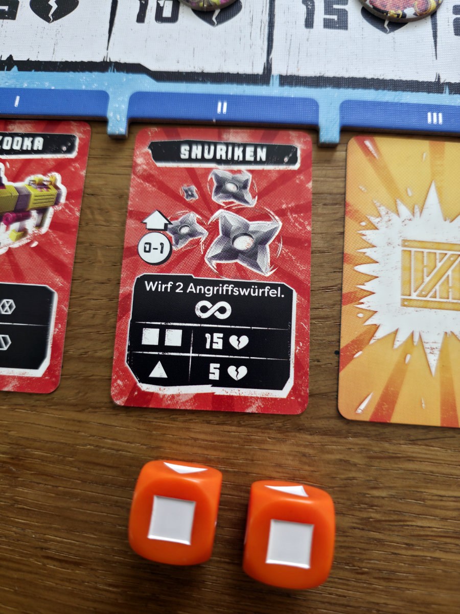 Die Waffen, von sinnvoll bis herrlich absurd, finden sich im Arsenalstapel, der – ganz ehrlich^^ – das Herz des Spiels ist. Man sollte immer versuchen an möglichst viele Karten zu gelangen, denn da finden sich z.B. Bazookas, Revolver, Granaten, Flammenwerfer, Dynamit, Minen, Teleportationskarten und Spezialausrüstungen wie Jetpacks oder Angelruten.