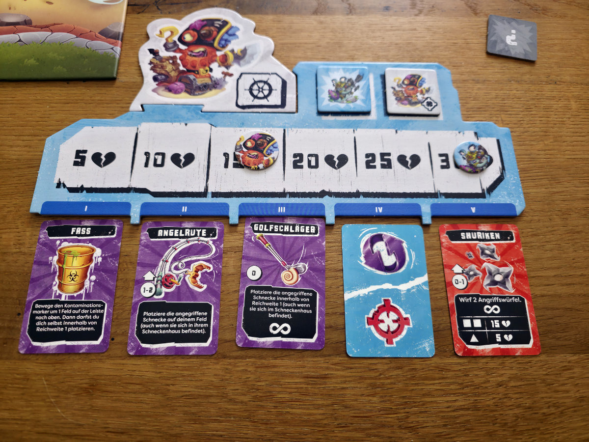 Die Planungsphase bringt das Drama auf den Plan, denn nun wählt jeder verdeckt eine aktive und eine inaktive Schnecke (Marker, die auf ihre entsprechenden Felder der Spielertafel gelegt werden – je nach Taktik können diese nämlich getauscht werden) und legt fünf Aktionskarten in eine Reihenfolge (von 1-5) unter die eigene Spielertafel. Diese Karten bestimmen, was die Schnecke später tut – und ob sie dabei heldenhaft glänzt oder spektakulär scheitert.