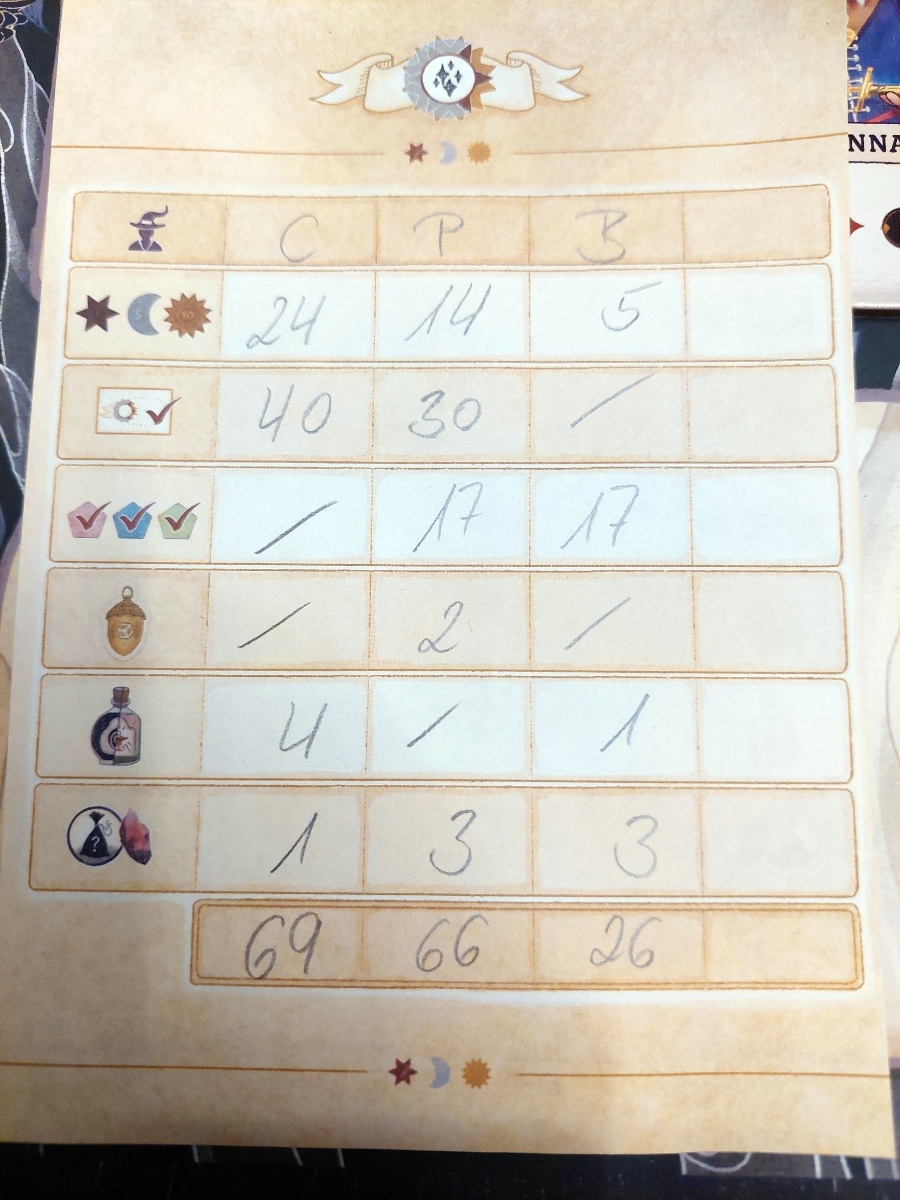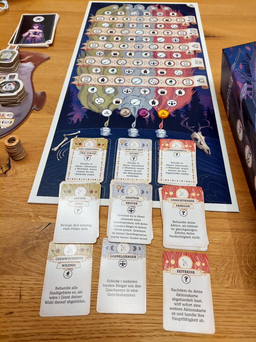 Außerdem sollte jeder immer seine eigenen, geheimen Ziele im Auge behalten. Eine entsprechende Karte zeigt an, welche Ziele erreicht werden sollen. Um alle 4 erfüllen zu können, werden auch 4 Hexen benötigt, was das Gewinnen der Prozesse wieder besonders interessant macht.
