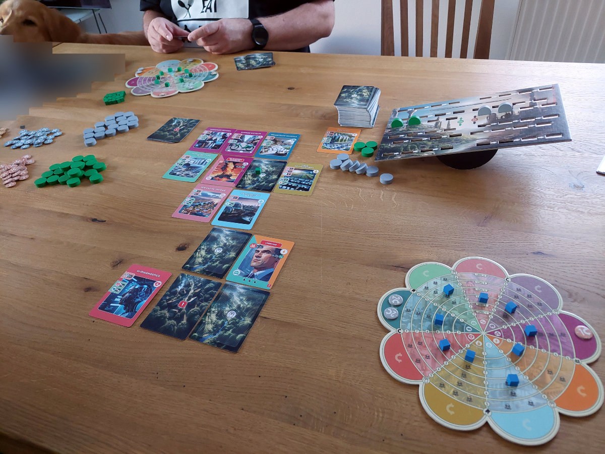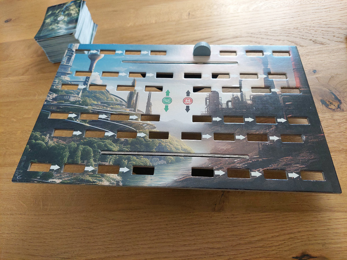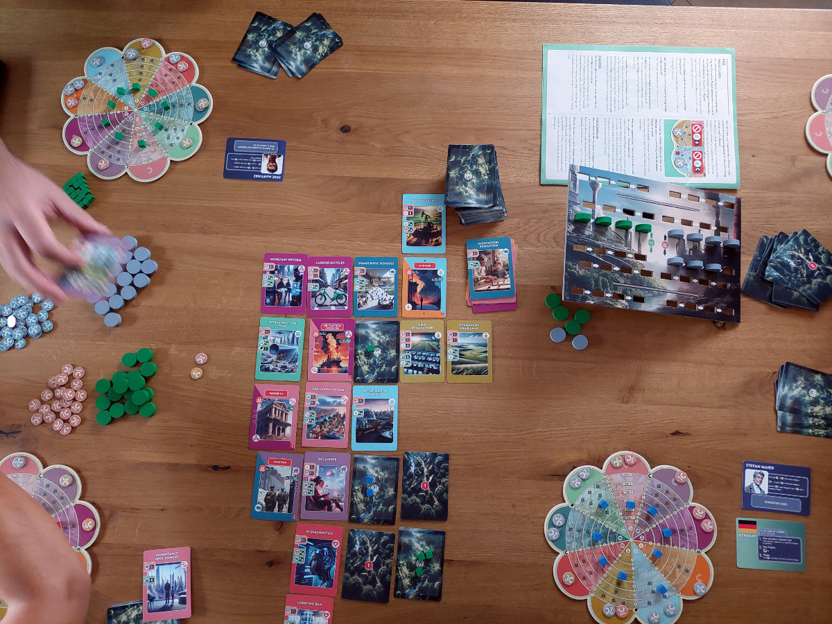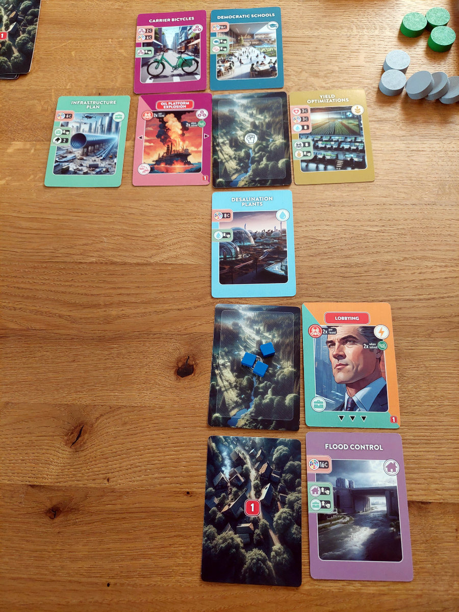 Das Spielertableau dient auch als quasi Einkommens- und Bonusmaschine und ist in 9 verschiedene Kategorien (Energie, Wasser, Gesundheit, Agrarwirtschaft,…) eingeteilt. Je weiter man in diesen Bereichen, durch das Ausspielen von Projektkarten, voranschreitet, desto mehr Einkommen oder Einfluss erhält man. Aber je weiter in den jeweiligen Richtungen geforscht wird, desto größer auch die Gefahr weiterer Verschmutzungen, die beim Fortschritt eben einfach nicht ausbleiben. Also gilt es auch hier die Balance zu beachten bzw. eben bei den Katastrophen rascher tätig zu werden, um keine Verschmutzungssteine zu sammeln, sondern bei Verhinderung die Belohnung der ausgleichenden grünen Marker.
