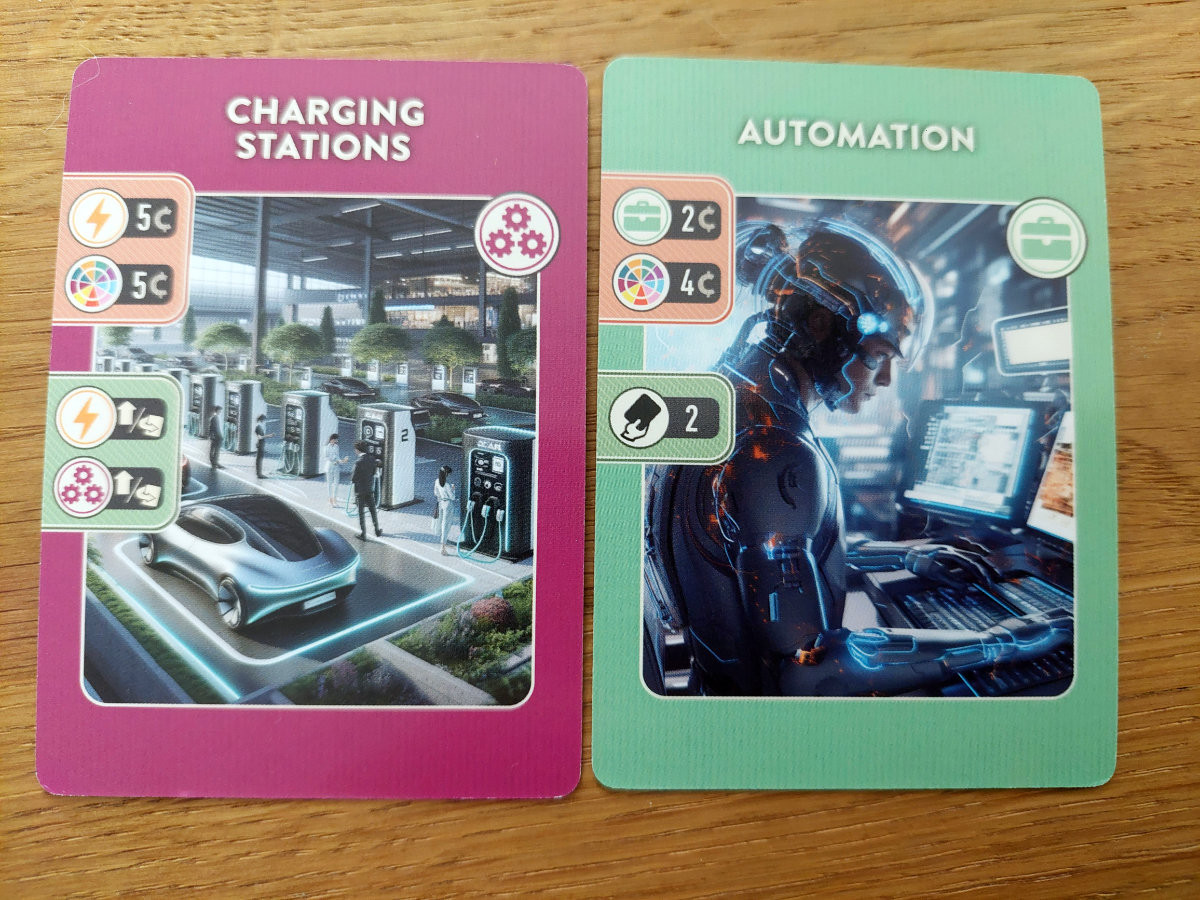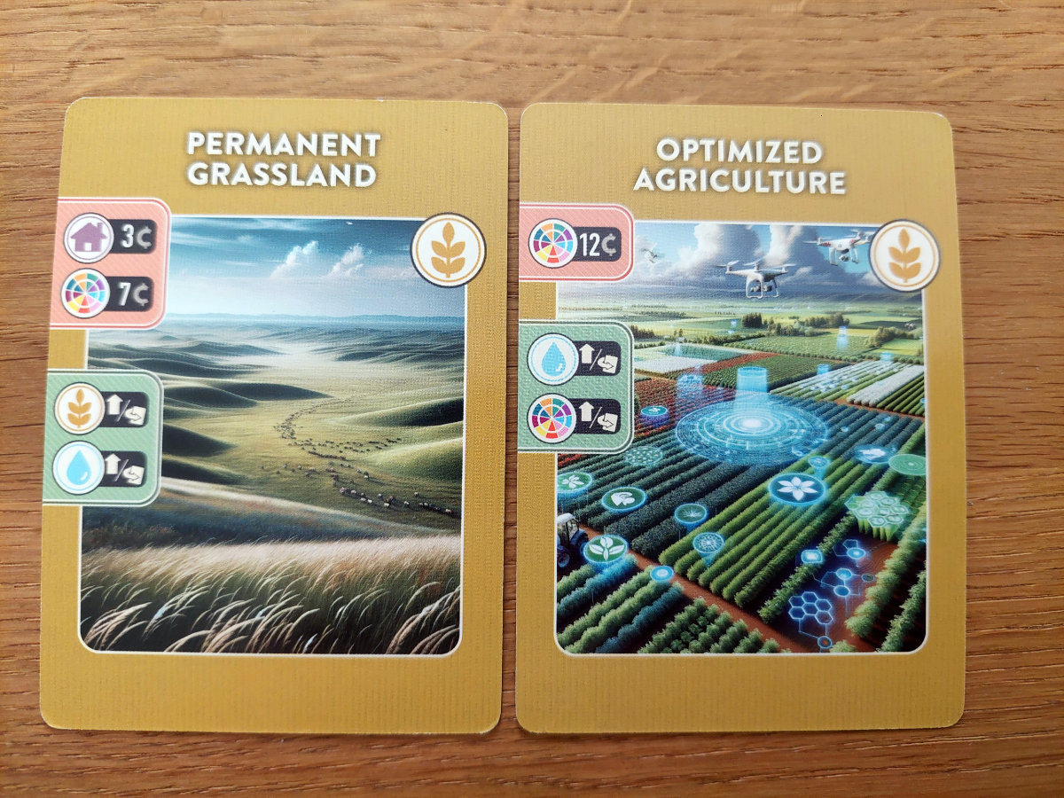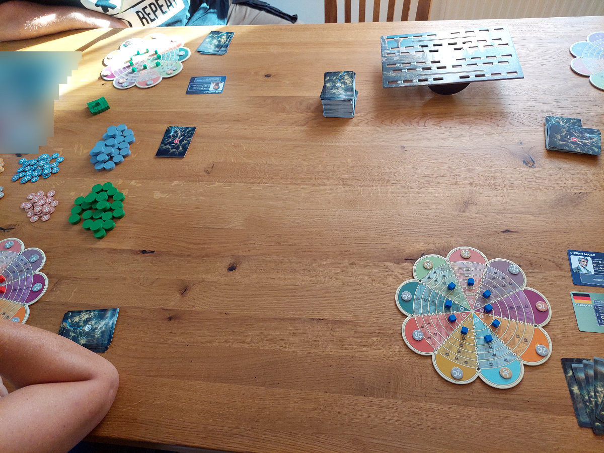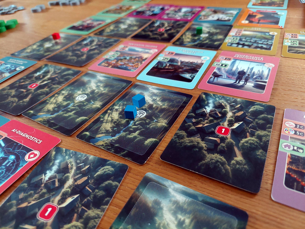 Das Spielertableau dient auch als quasi Einkommens- und Bonusmaschine und ist in 9 verschiedene Kategorien (Energie, Wasser, Gesundheit, Agrarwirtschaft,…) eingeteilt. Je weiter man in diesen Bereichen, durch das Ausspielen von Projektkarten, voranschreitet, desto mehr Einkommen oder Einfluss erhält man. Aber je weiter in den jeweiligen Richtungen geforscht wird, desto größer auch die Gefahr weiterer Verschmutzungen, die beim Fortschritt eben einfach nicht ausbleiben. Also gilt es auch hier die Balance zu beachten bzw. eben bei den Katastrophen rascher tätig zu werden, um keine Verschmutzungssteine zu sammeln, sondern bei Verhinderung die Belohnung der ausgleichenden grünen Marker.