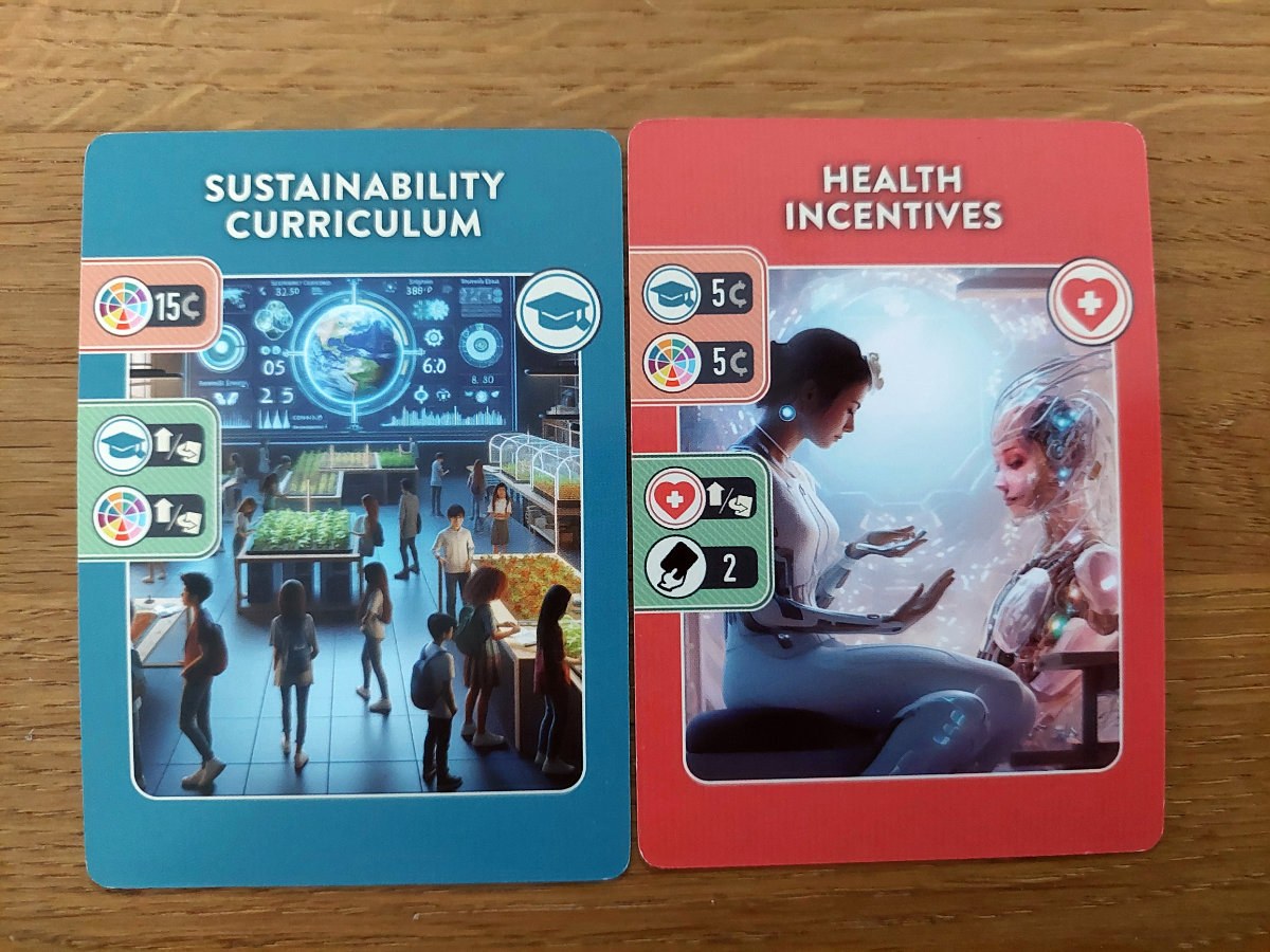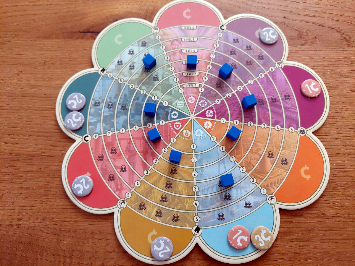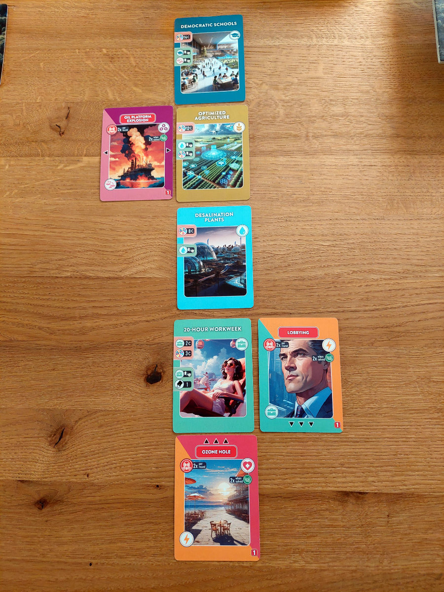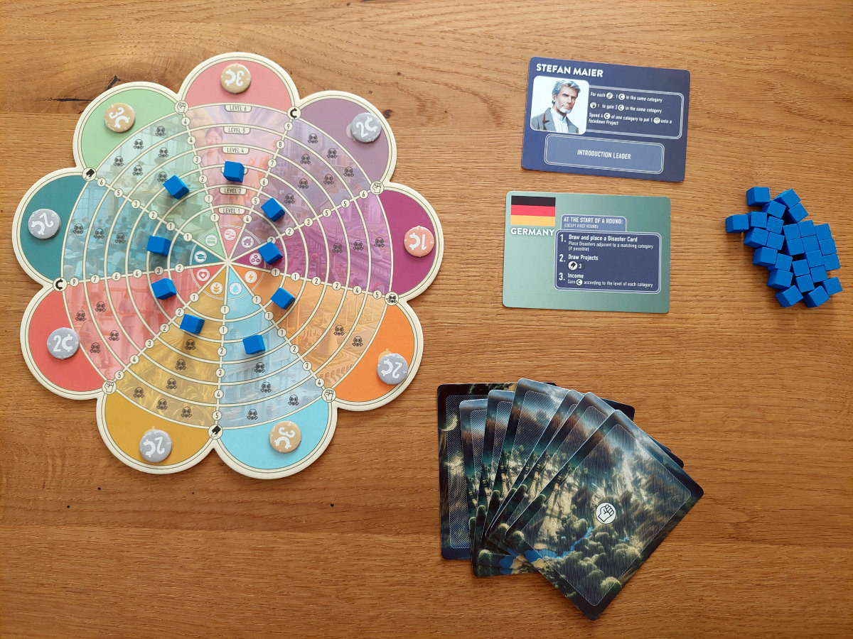 Das Spiel bietet eine enorme taktische Tiefe, die sich erst im Spielverlauf fühlbar darstellt. Anfänglich geht man unter Umständen zu behutsam vor, das sollte sich schnell ändern, denn ein Spielende kann schneller vorkommen, als man glaubt. Die vielen, auch abwechslungsreichen, Möglichkeiten zu agieren, ergeben sich vor allem durch das genaue Beachten des eigenen Spielertableaus und den zu erreichenden Stufen der 9 Kategorien. Denn, wenn diese gut austariert sind, erhält man auch regelmäßig wertvolles Einkommen, mit dem man die Projekte realisiert und dadurch den vielen – gar nicht mal so kreativen, weil dies leider alles nur zu wahr ist – Katastrophen entgegenwirkt.