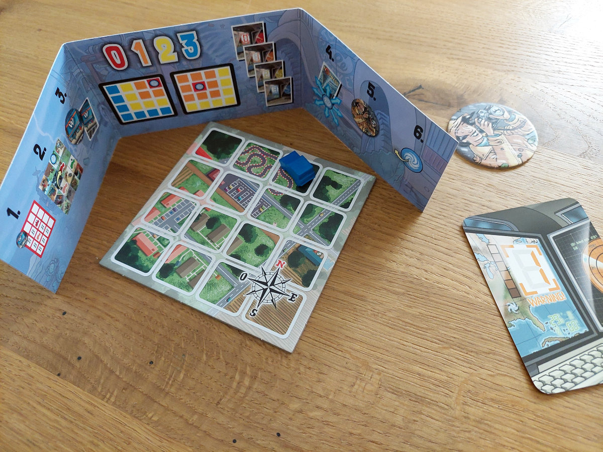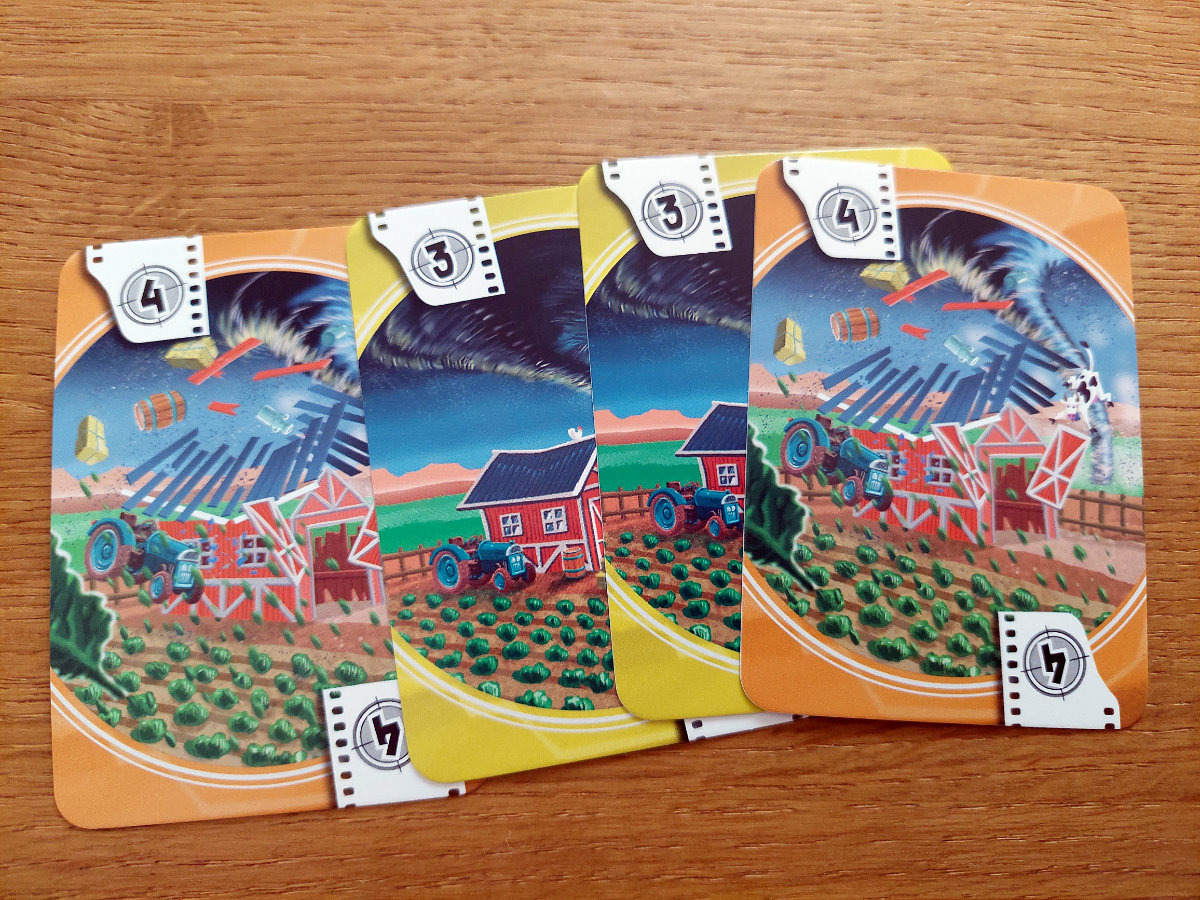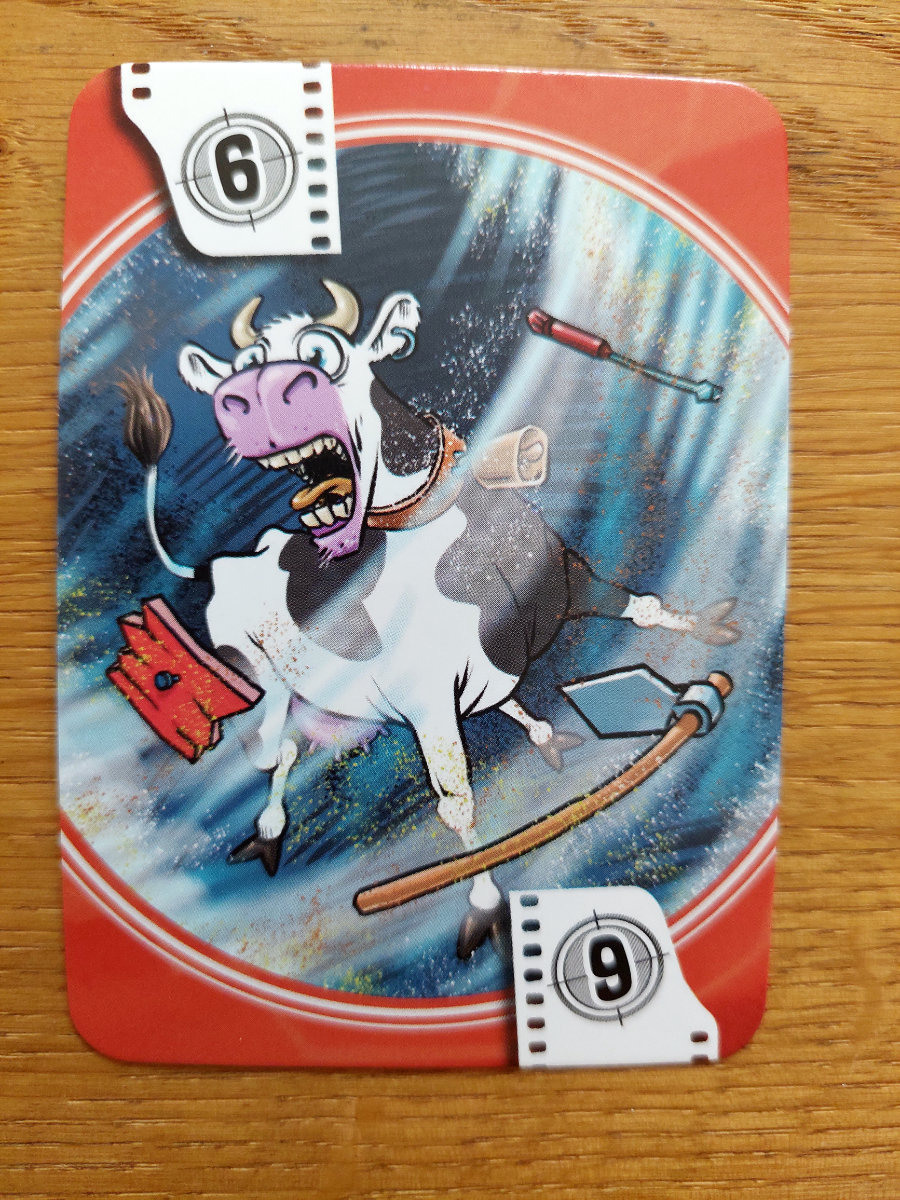 All dies geschieht auf einem modularen Spielfeld mit schicken Grafiken. Die Spielkomponenten sind überhaupt allesamt gut, nur die Anleitung weiß nicht so recht zu überzeugen aufgrund diverser Ungenauigkeiten. Mit der Zeit kommt man aber „rein“. Das Spiel an sich ist nett und dient als Absacker oder für zwischendurch. Bonuspunkte gibt es auf jeden Fall für die „Kuh-Karte“ 😉 in Anlehnung an den ersten „Twister“-Film *G*.