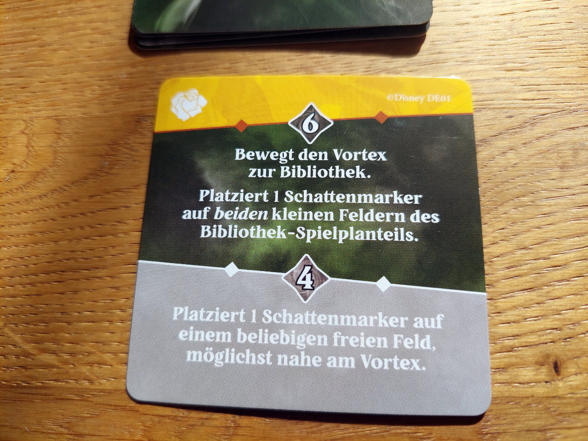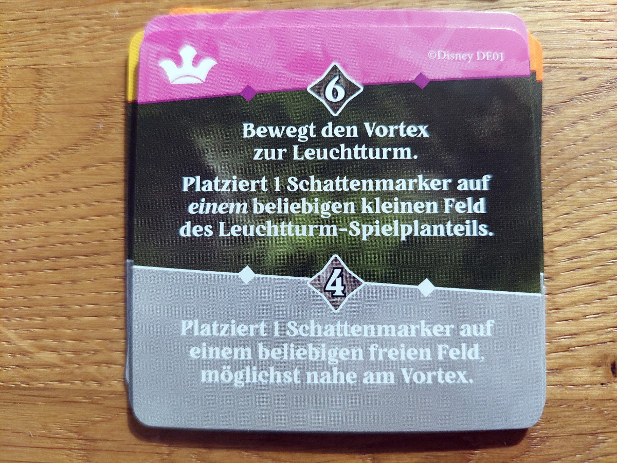 Hat jede ihre Mission erfüllen können, geht es nun noch darum den Vortex zu vernichten. Dies geschieht in 2 Akten, einmal wird er zunächst geschwächt und dann erst ausgelöscht. Gelingt dies und sind alle Schattenmonster zudem erledigt, gewinnen alle gemeinsam. Der Haken bei der Sache ist aber die Zeit, denn jedes Mal, wenn die Aktionstafel komplett bestückt wurde, endet ein Tag. Und mit jedem neuen Tag wird eine Dunkel-Karte aufgedeckt, die u.a. neue Schattenmonster heraufbeschwört. Das eigentliche Problem aber ist, dass diese Kartenzahl begrenzt ist und wenn die letzte Karte aufgedeckt wurde und der Tag endet, endet auch das Spiel! Wurde bis hierhin nicht alles geschafft, verlieren alle gemeinsam. Verloren wird auch, wenn der Lebenspunkte-Meter des Teams auf 0 sinkt – geschieht durch Lebenspunkteverluste der Heldinnen z.B.!