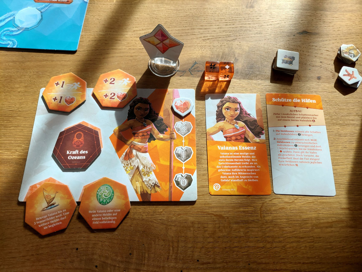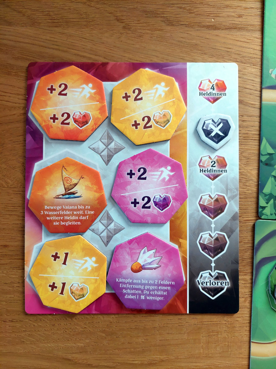 2 Marker sind bei allen gleich, diese werden zur Bewegung (+1, +2) genutzt oder zum Heilen (+1, +2). Dann hat eine jede noch 2 auf sie speziell zugeschnittene Marker (Vaiana z.B. hat ein Boot, welches 3 Seefelder weit fahren und eine andere Heldin mitnehmen kann und die Möglichkeit eine Heldin an einem beliebigen Ort voll zu heilen). Ferner steht allen noch eine mächtige Markerfunktion zur Verfügung, sobald die eigene Mission erfüllt wurde.