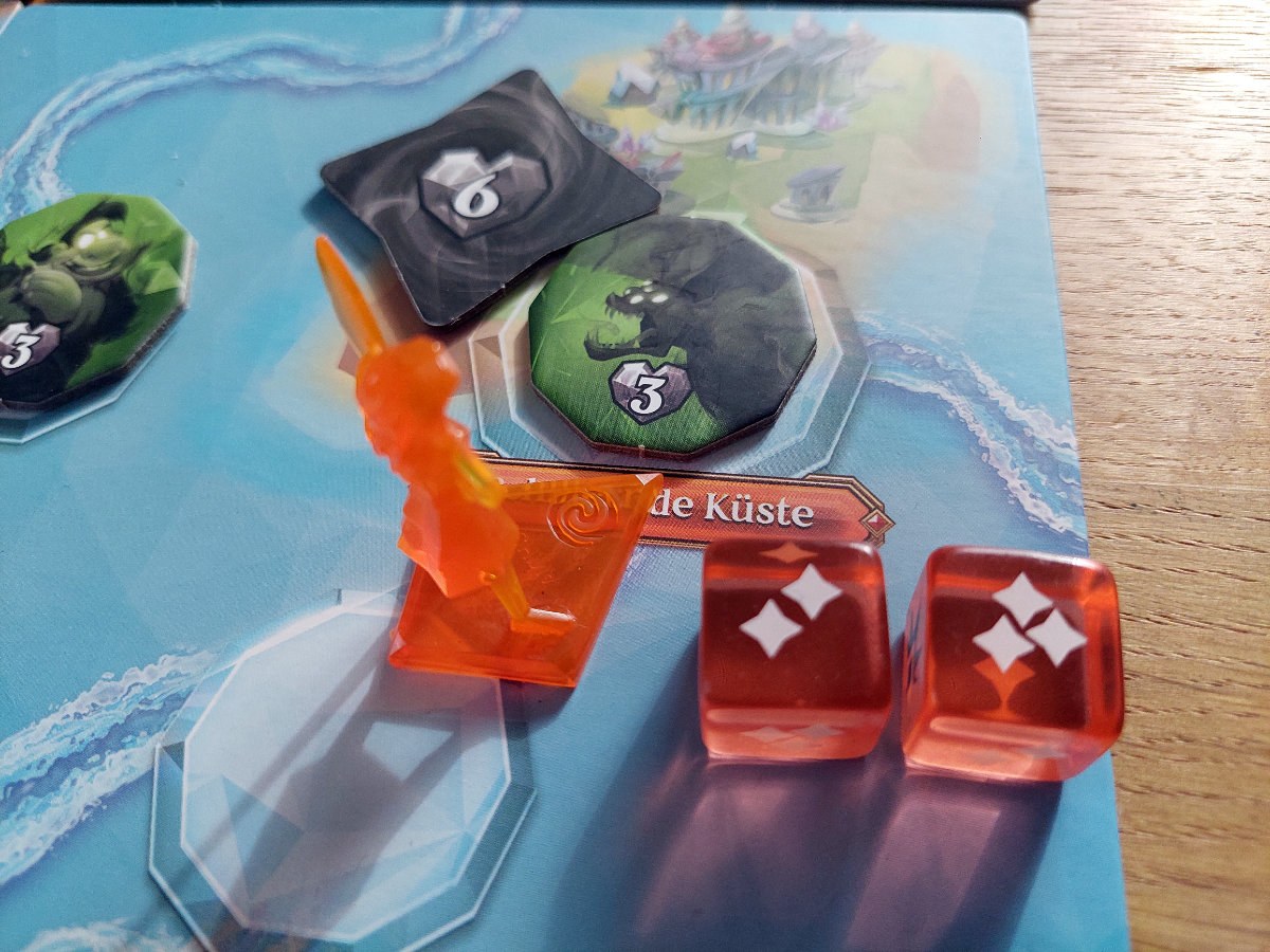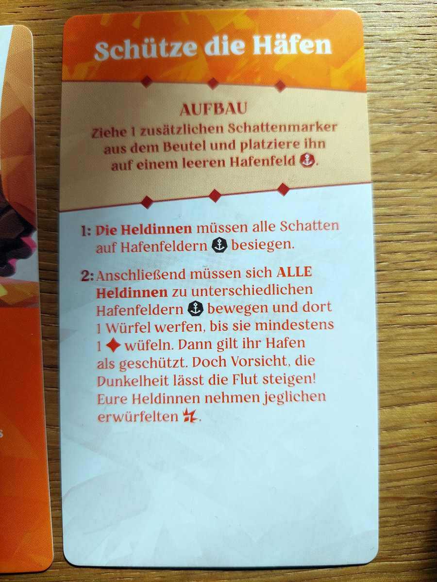 Die Missionen sind leicht verständlich und an sich gut lösbar. Es muss halt nur geschaut werden, dass die Dunkel-Karten nicht so schnell zur Neige gehen bzw. die nötigen Aktionen nur auf das Nötigste beschränkt werden. Gerade bei Kämpfen gegen stärkere Monster, sollten keine Solo-Versuche gestartet und so Zeit verschwendet werden, da hier das Würfelglück eine große Rolle spielt. Mehr Heldinnen bedeuten mehr Würfel und so mehr Kampfkraft.