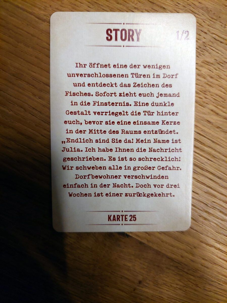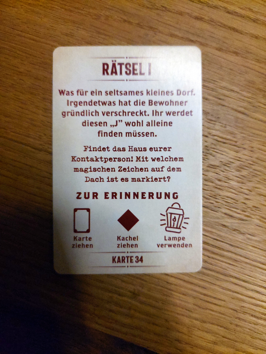 Es beginnt alles mit einer unverheissungsvollen Nachricht, die ins Dorf einlädt. Und da beginnt schon das erste Rätsel, denn der Absender will noch gefunden werden bzw. erst einmal sein Haus. Generell werden nach und nach „Kacheln“ (Planteile) aufgedeckt (und gefunden), die das Dorf und die Umgebung darstellen. Auf diesen sind wiederum Rätsel wie Hinweise zu entdecken. So wird man mit eingesetztem Hirnschmalz und vielen Gesprächen untereinander nach und nach in die Geschichte eingeführt. Dabei entfalten sich viele Unwegsamkeiten und erst spät wird klar, auf was man sich da eingelassen hat.