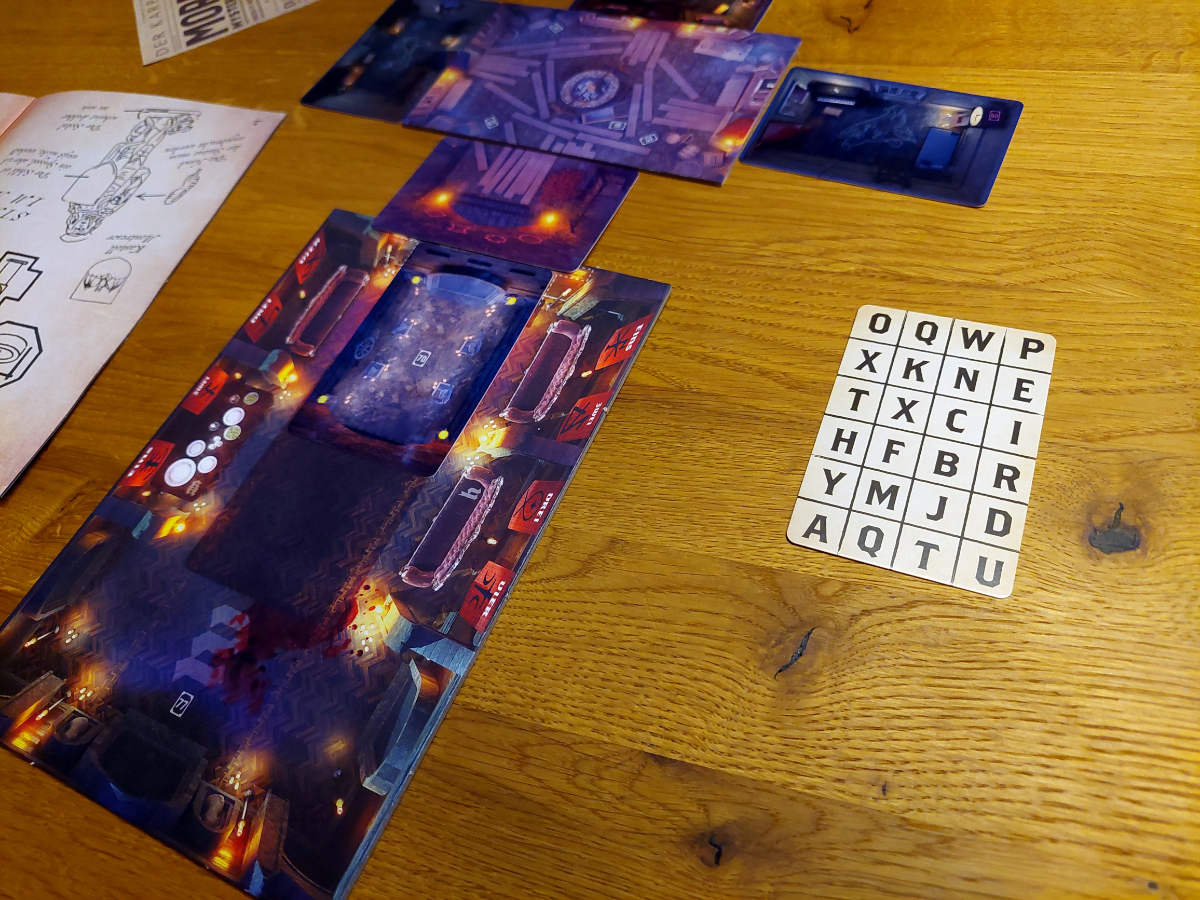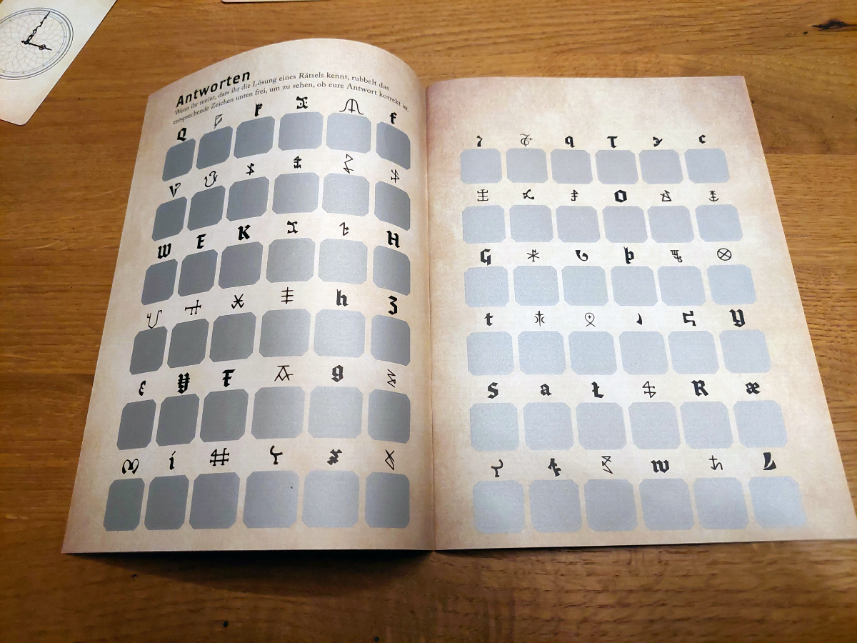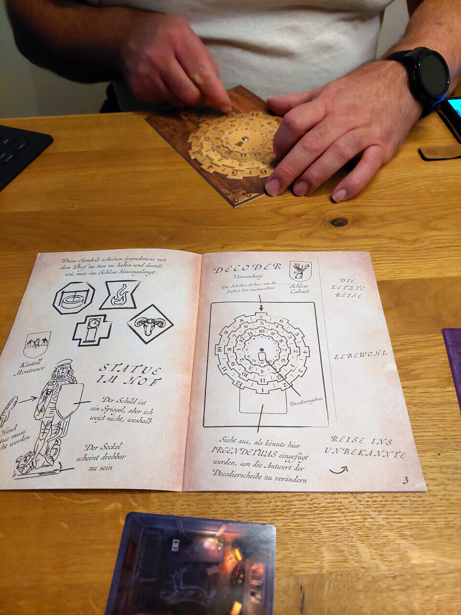 Karten, die einerseits Teile der Geschehnisse erklären und andererseits durch Teilrätsel und Bilder weiteres zum Grübeln präsentieren, sind da die nächste Ressource. Darüber hinaus gibt es nach und nach so manches Werkzeug zu entdecken, zum Basteln, Nachschlagen und (zweckentfremdlich?^^) Nutzen. Ein, nicht inkludiertes, Smartphone hilft zudem hie und da, um Erleuchtung zu gewähren.