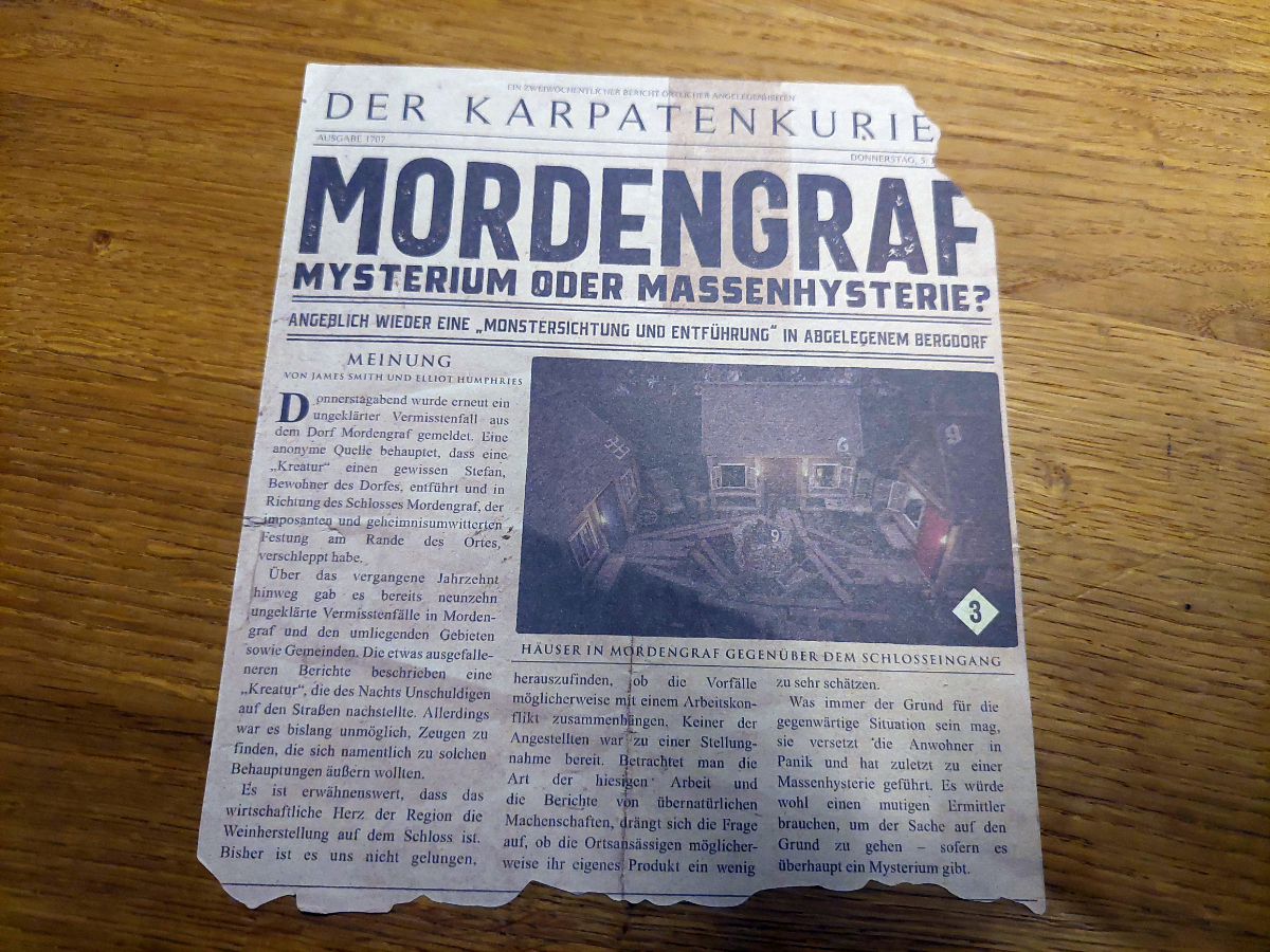 Das Spiel kann einen richtig fesseln und bietet mehr als die 3 Stunden Spielspaß, da man sich auch anschliessend noch unterhaltend damit beschäftigen wird. In unseren Gruppen gibt es eigentlich keine Fans des Genres, aber dieses Spiel wusste dennoch zu fesseln. Die gewisse Andersartigkeit, die Optik, das Material…irgendwie konnte es die Spielrunde packen. Und apropos Material, alles was im Spielverlauf zerschnippelt werden müsste, lässt sich auch herunterladen und ausdrucken. Das bricht etwas die Atmosphäre, erlaubt aber dann das Spiel eventuell weiter zu geben!