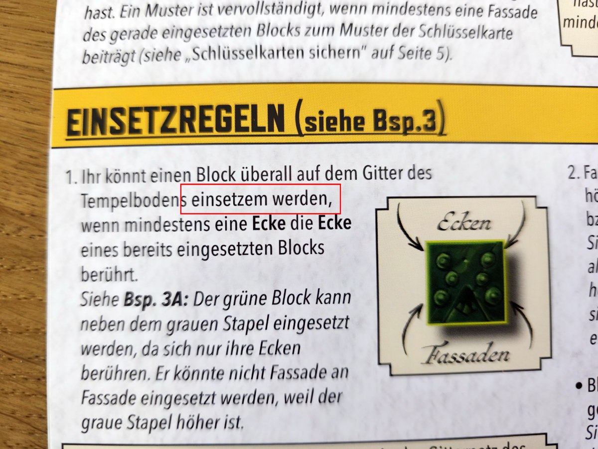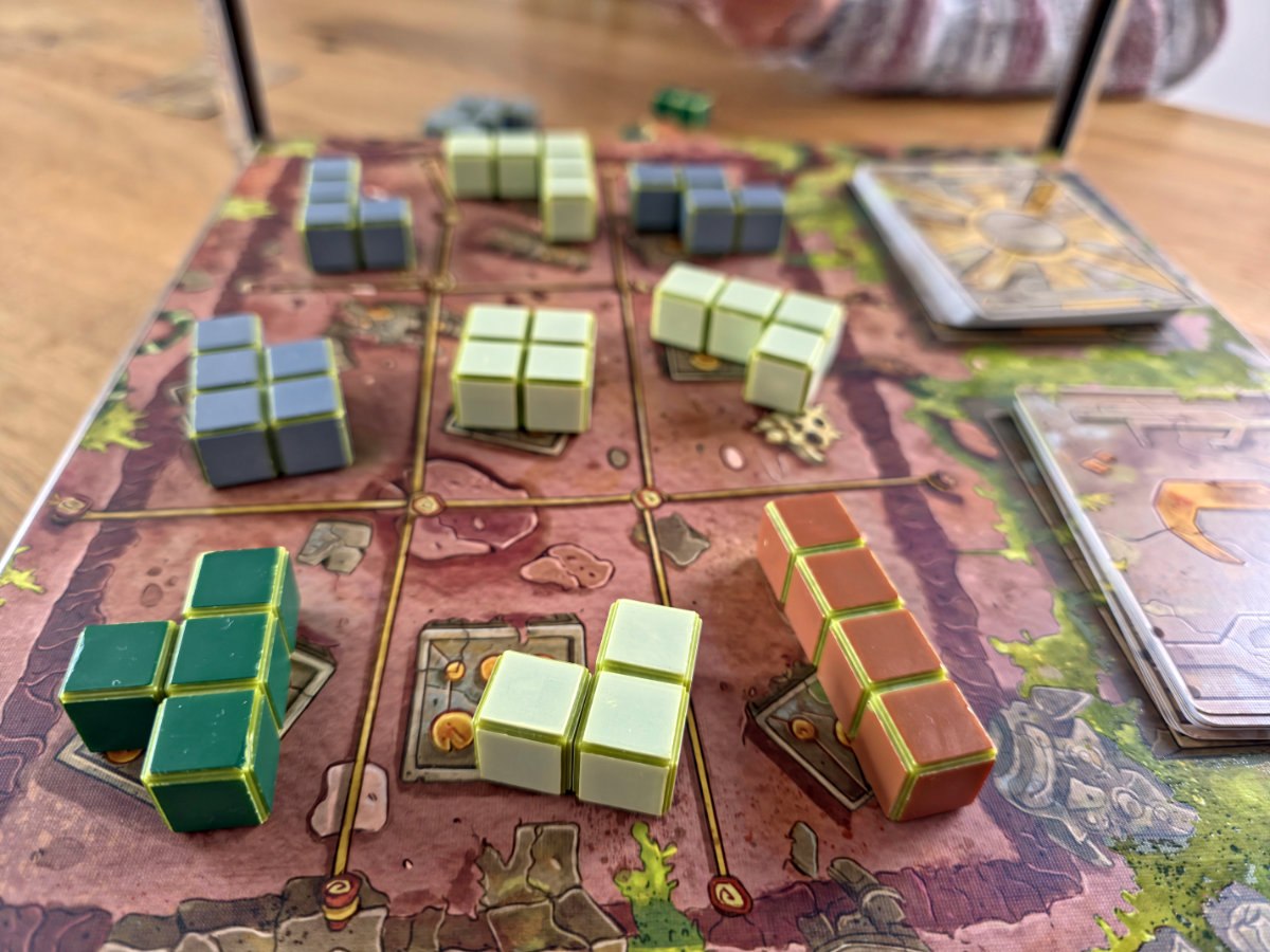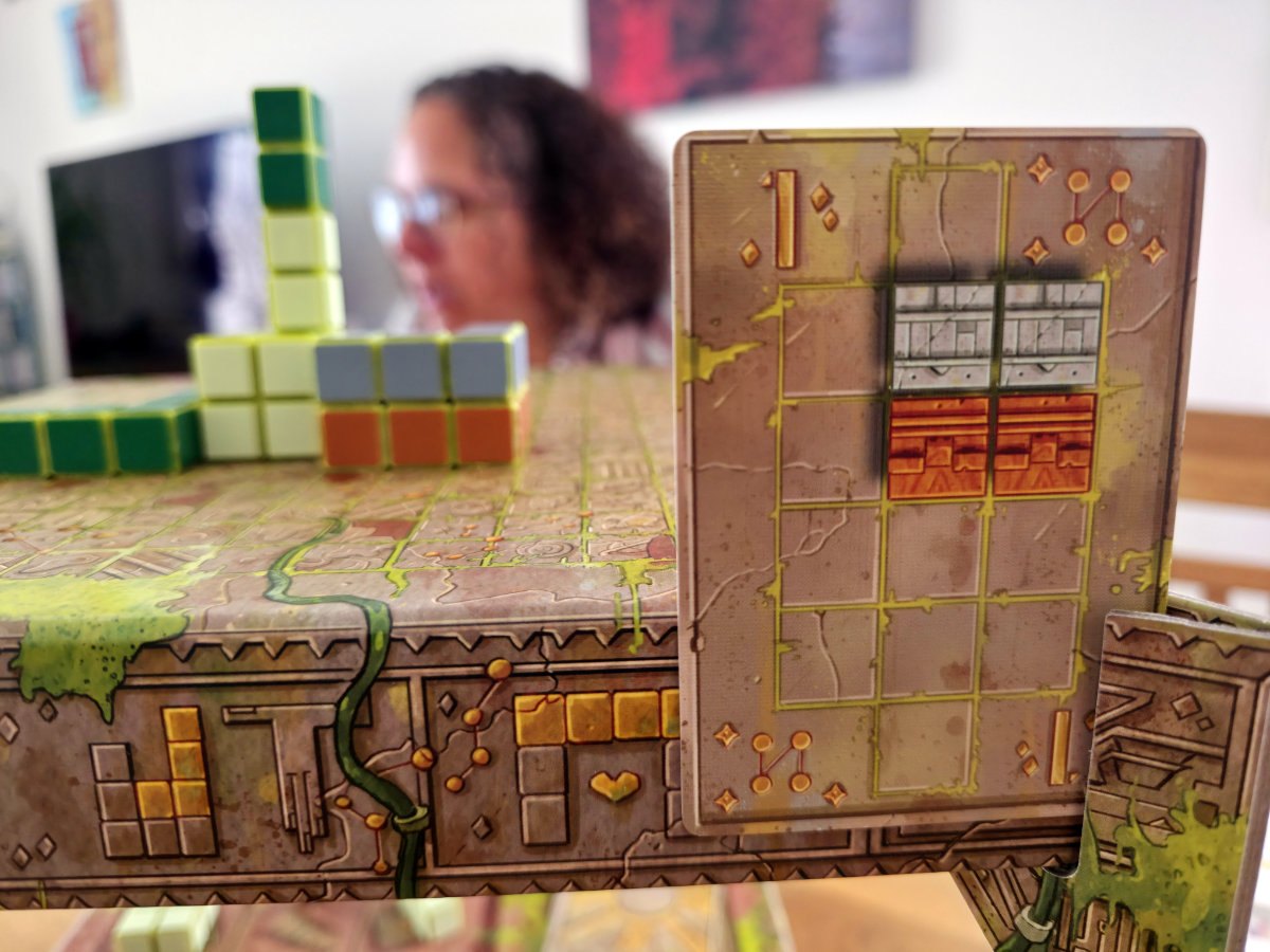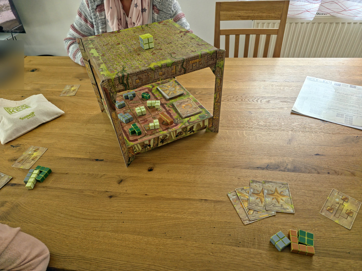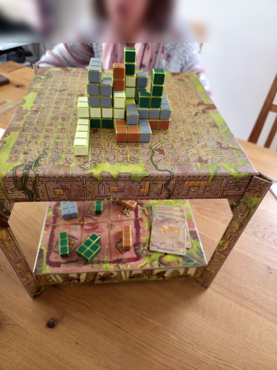 Das Spiel an sich ist kurzweilig, optisch ansprechend – insbesondere die schweren Steine machen etwas her – und kann angenehm fordernd sein. Den Tempel korrekt zusammen zu stellen ist etwas hakelig und wenn das nicht richtig gemacht wird – es gibt keine Anleitung/Hinweise hierzu – wackelt es die ganze Zeit. Auch die Spielanleitung lässt hier und da etwas zu wünschen übrig, aber man kommt schon rein ins Spiel. Die Idee mit der zu berücksichtigen 2D-Perspektive zum Erfüllen der Aufgabenkarten ist einerseits cool, andererseits, je nach Körpergröße, etwas hinderlich, um den wirklich optimalen Blick auf das Geschehen zu haben. Auch, dass man sich schon mal leicht vertun kann und damit versehentlich schummelt oder immer alle um den Tisch kommen müssen, um mit zu schauen, ob es passt, kann den Spielfluss hemmen.