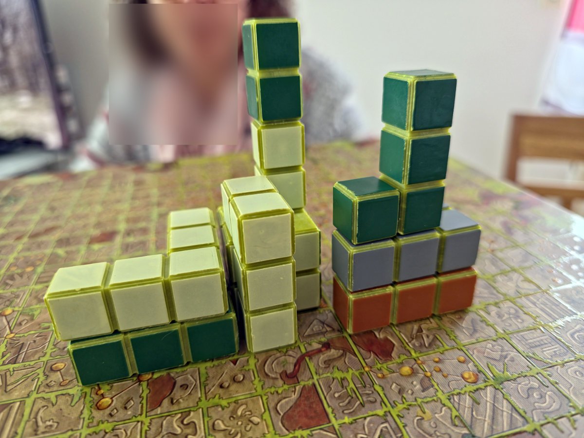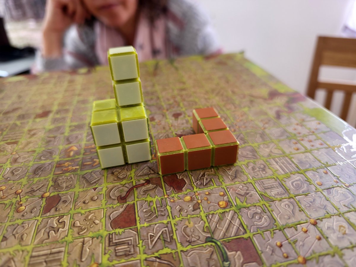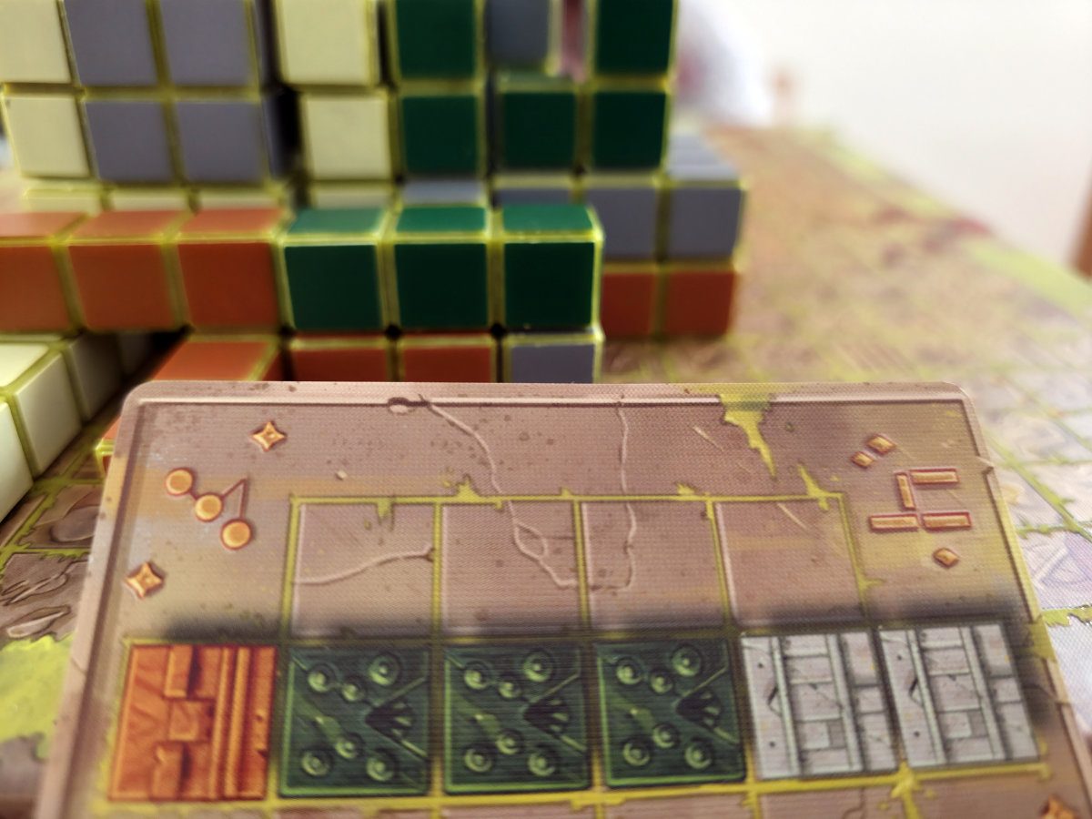 In seinem Zug wählt der aktive Spieler, ob er einen Stein oben verbauen will oder von unten Nachschub nimmt. In letzterem Fall müssen aus dem 3×3-Raster immer alle Steine einer Reihe oder Spalte genommen werden – und anschließend aufgefüllt werden. Kann er einen Stein einsetzen tut er dies stattdessen und hofft auf die Erfüllung einer Aufgabe später…oder, wenn es direkt gelingt eine der eigenen Aufgabenkarten (in drei Schwierigkeitsgraden verfügbar (leichte nur zu Beginn, zum Nachziehen dann mittelschwere und schwere)) zu erfüllen, wird dies kundgetan und eventuell, je nach Vertrauensbonus^^, allen gezeigt, indem diese zur perspektivischen Ansicht herumgebeten werden. Passt alles, wird die erledigte Karte beiseite gelegt – deren Punkte zählen am Ende – und eine Neue nachgezogen. Gebaut werden darf dabei übrigens nur orthogonal, wenn direkt anliegend benachbarte Steine nicht gleich hoch oder höher sind – dann am besten diagonal anbauen, um die Nachbarschaft zunächst auszuschließen – und die Gesamthöhe darf nie sechs Steine übersteigen.