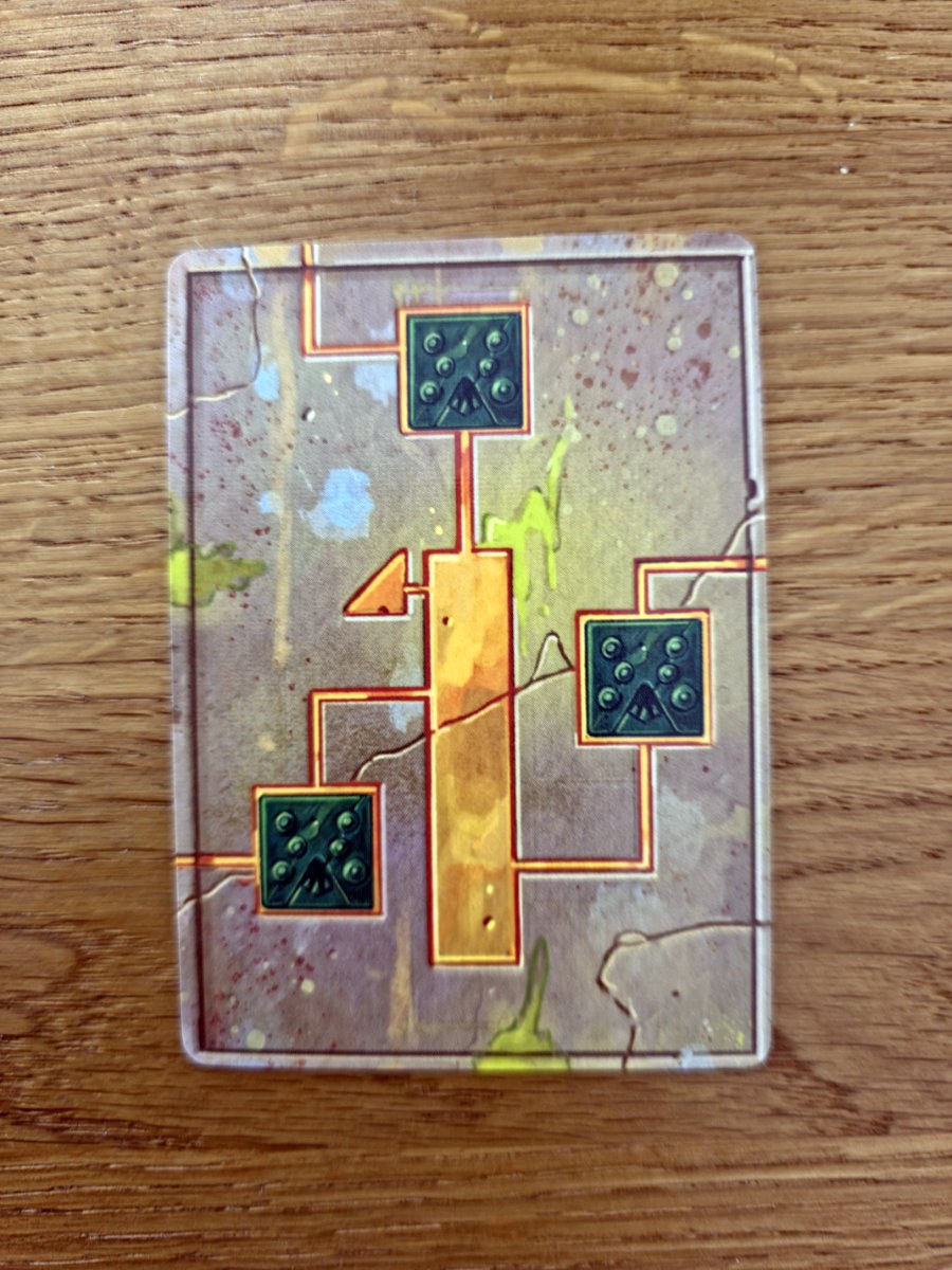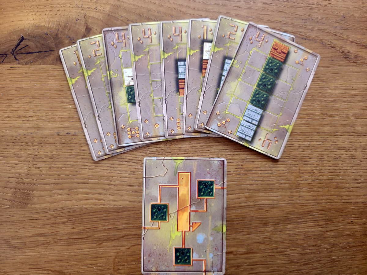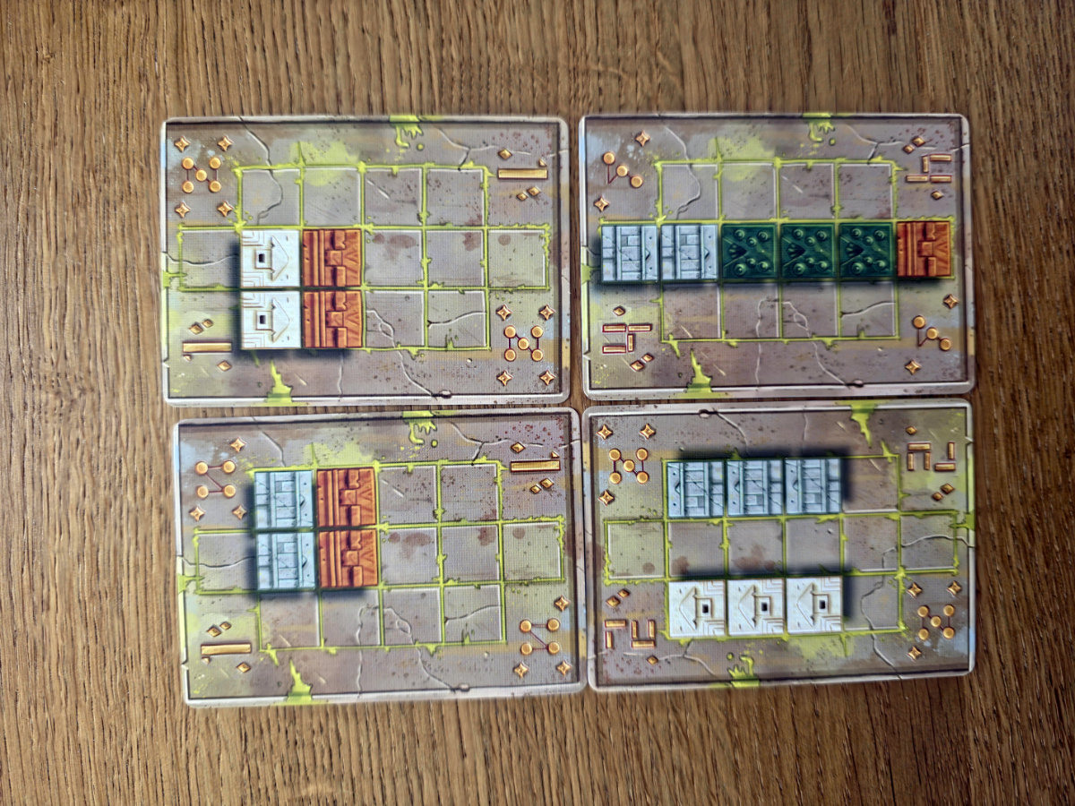 In seinem Zug wählt der aktive Spieler, ob er einen Stein oben verbauen will oder von unten Nachschub nimmt. In letzterem Fall müssen aus dem 3×3-Raster immer alle Steine einer Reihe oder Spalte genommen werden – und anschließend aufgefüllt werden. Kann er einen Stein einsetzen tut er dies stattdessen und hofft auf die Erfüllung einer Aufgabe später…oder, wenn es direkt gelingt eine der eigenen Aufgabenkarten (in drei Schwierigkeitsgraden verfügbar (leichte nur zu Beginn, zum Nachziehen dann mittelschwere und schwere)) zu erfüllen, wird dies kundgetan und eventuell, je nach Vertrauensbonus^^, allen gezeigt, indem diese zur perspektivischen Ansicht herumgebeten werden. Passt alles, wird die erledigte Karte beiseite gelegt – deren Punkte zählen am Ende – und eine Neue nachgezogen. Gebaut werden darf dabei übrigens nur orthogonal, wenn direkt anliegend benachbarte Steine nicht gleich hoch oder höher sind – dann am besten diagonal anbauen, um die Nachbarschaft zunächst auszuschließen – und die Gesamthöhe darf nie sechs Steine übersteigen.