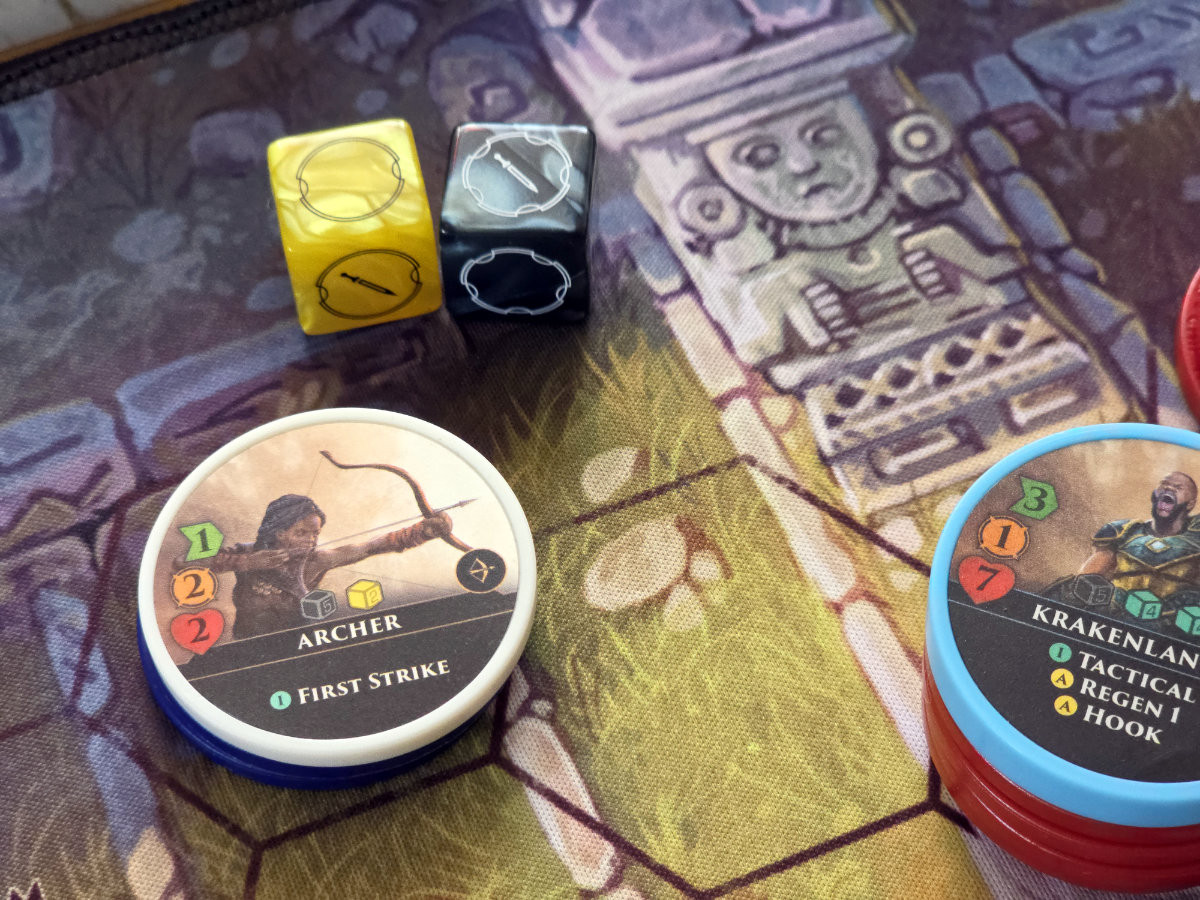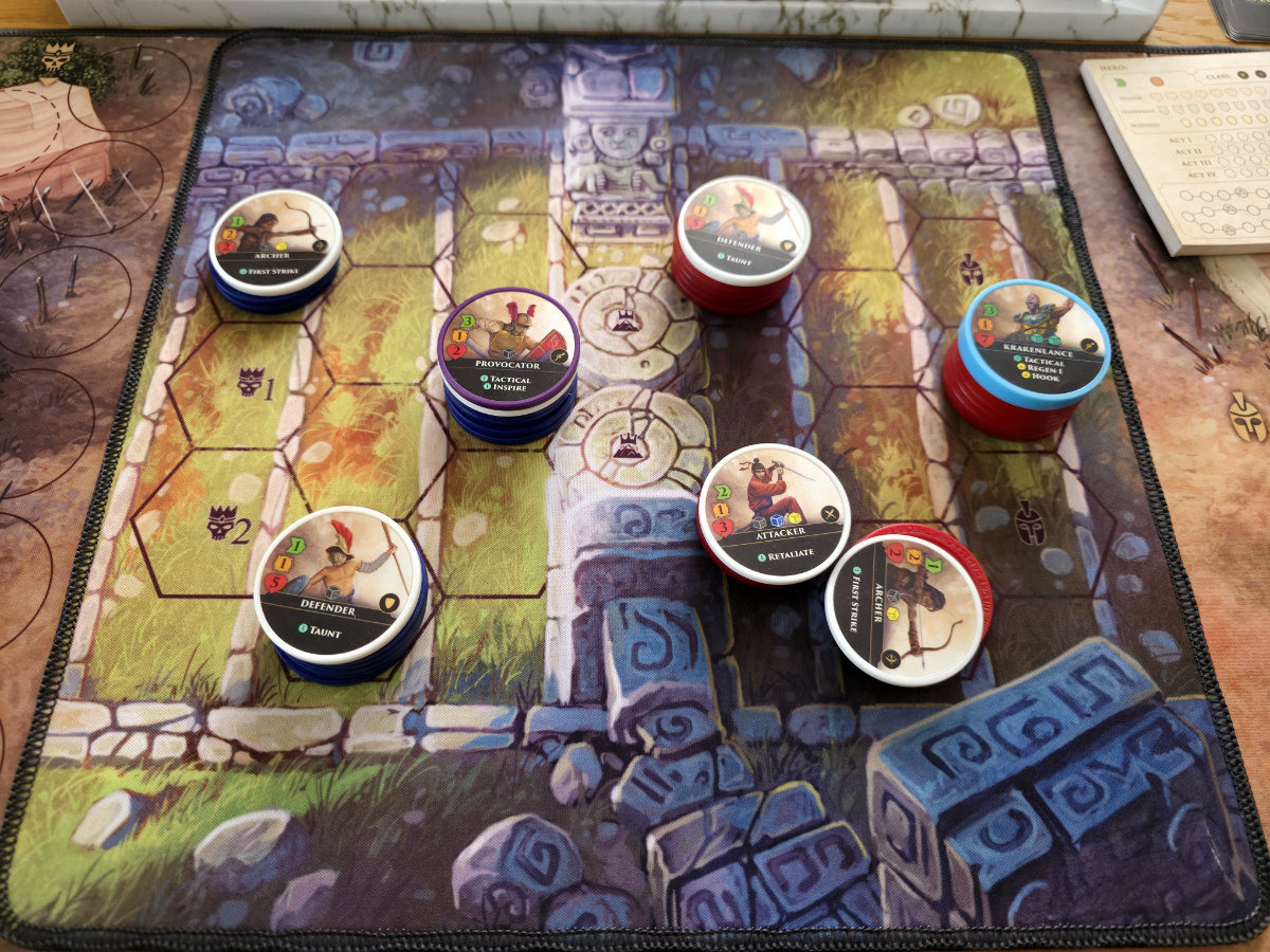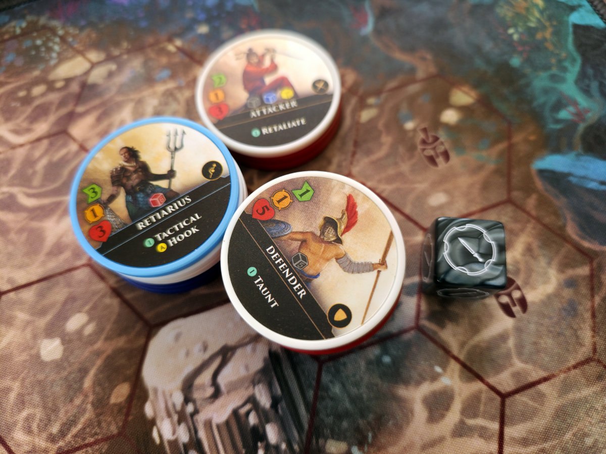 Da der jeweilige Endgegner und dessen Residenz bekannt ist, weiss man auch, wo man hin zu reisen hat und folgt entsprechend den Pfaden (gestrichelte Linien, die manchmal etwas schwer auszumachen sind) auf der Karte. An den jeweiligen Orten werden dann unterschiedliche Arenen und Begebenheiten offenbart. Je nach vorgegebenen Regeln wird entsprechend gekämpft und hoffentlich die erfolgreichen Taktiken gewählt. Sollte der Held doch einmal das Zeitliche segnen, stehen diesem 8 Segen zur Verfügung, durch die er wieder wundersam geheilt parat steht. Wie in Hoplomachus kommt es hier auch auf die geschickte Positionierung der eigenen Einheiten an, das richtige Quentchen Glück zu haben und die jeweils möglichen Spezialfähigkeiten bzw. -effekte von Einheiten oder eines Szenariokampfes zu beachten.