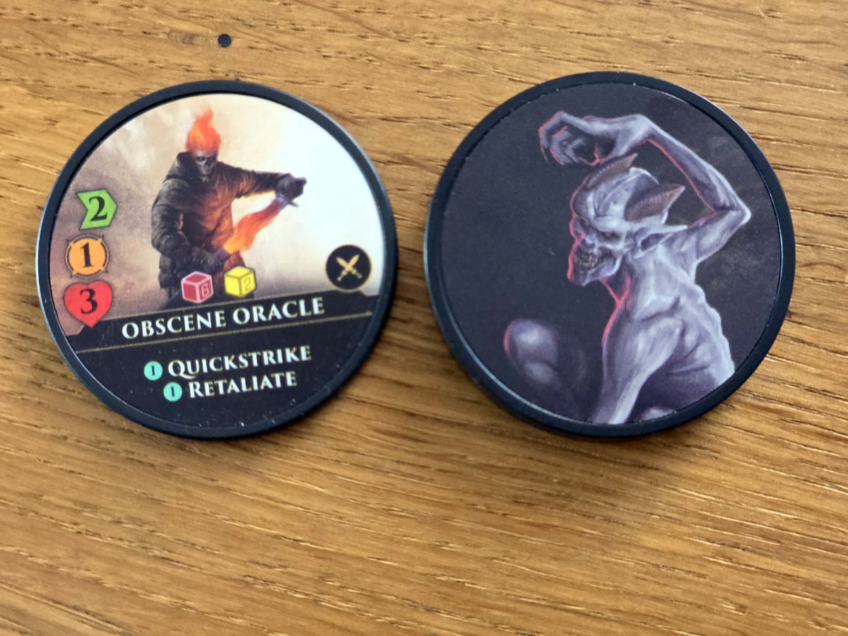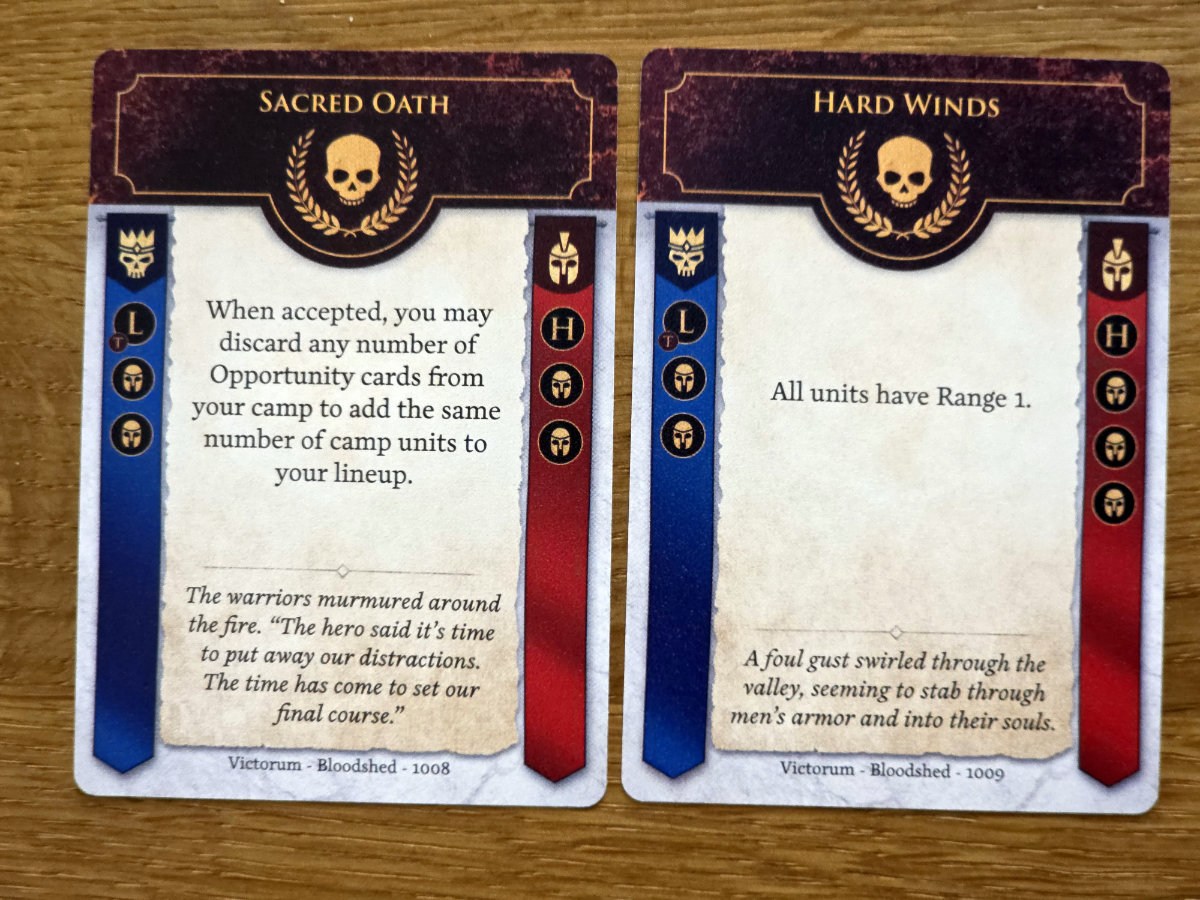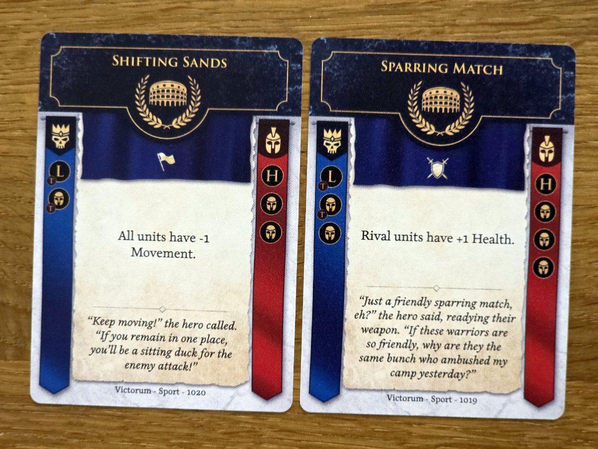 Da der jeweilige Endgegner und dessen Residenz bekannt ist, weiss man auch, wo man hin zu reisen hat und folgt entsprechend den Pfaden (gestrichelte Linien, die manchmal etwas schwer auszumachen sind) auf der Karte. An den jeweiligen Orten werden dann unterschiedliche Arenen und Begebenheiten offenbart. Je nach vorgegebenen Regeln wird entsprechend gekämpft und hoffentlich die erfolgreichen Taktiken gewählt. Sollte der Held doch einmal das Zeitliche segnen, stehen diesem 8 Segen zur Verfügung, durch die er wieder wundersam geheilt parat steht. Wie in Hoplomachus kommt es hier auch auf die geschickte Positionierung der eigenen Einheiten an, das richtige Quentchen Glück zu haben und die jeweils möglichen Spezialfähigkeiten bzw. -effekte von Einheiten oder eines Szenariokampfes zu beachten.
