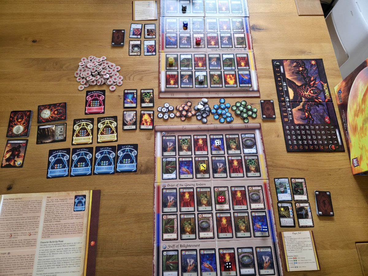 Review-Fazit zu „The Masters‘ Trials: Wrath of Magmaroth“, einem kooperativen Würfel- und Ressourcenmanagementspiel.