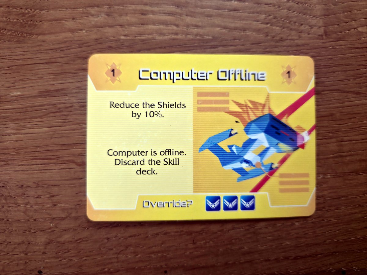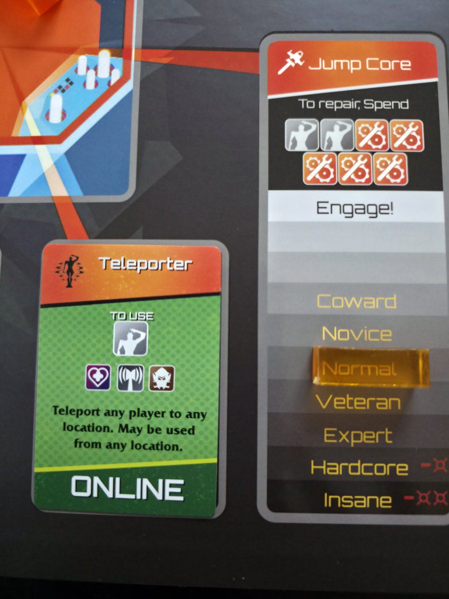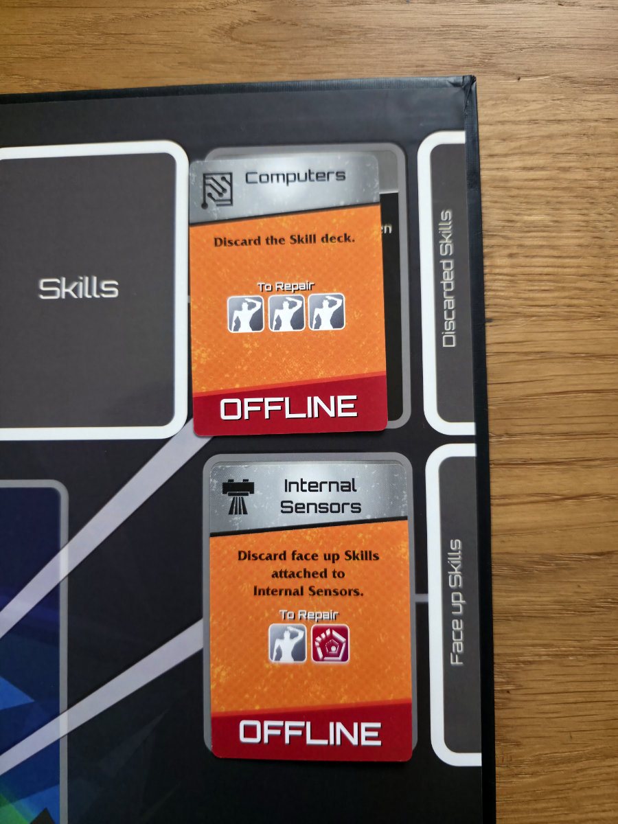 Gewonnen wird nur, wenn der Jump Core bis zur Stufe „Engage!“ hochrepariert wurde. Je nach Schwierigkeitsgrad braucht man dafür mehrere Reparaturen, die jeweils 5 Engineering kosten. Das bedeutet, das man das „Skill“-Kartendeck mehrfach durchspielen, effizient handeln und jede Aktion wertvoll machen muss. Und währenddessen brennt das Schiff weiter.